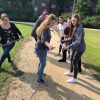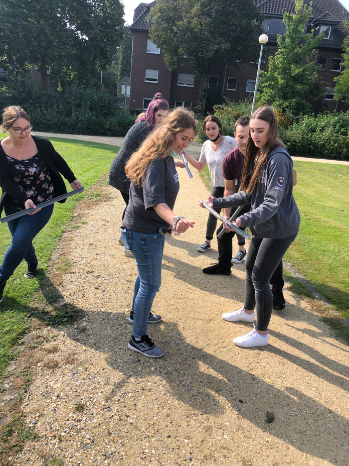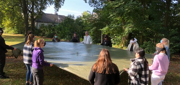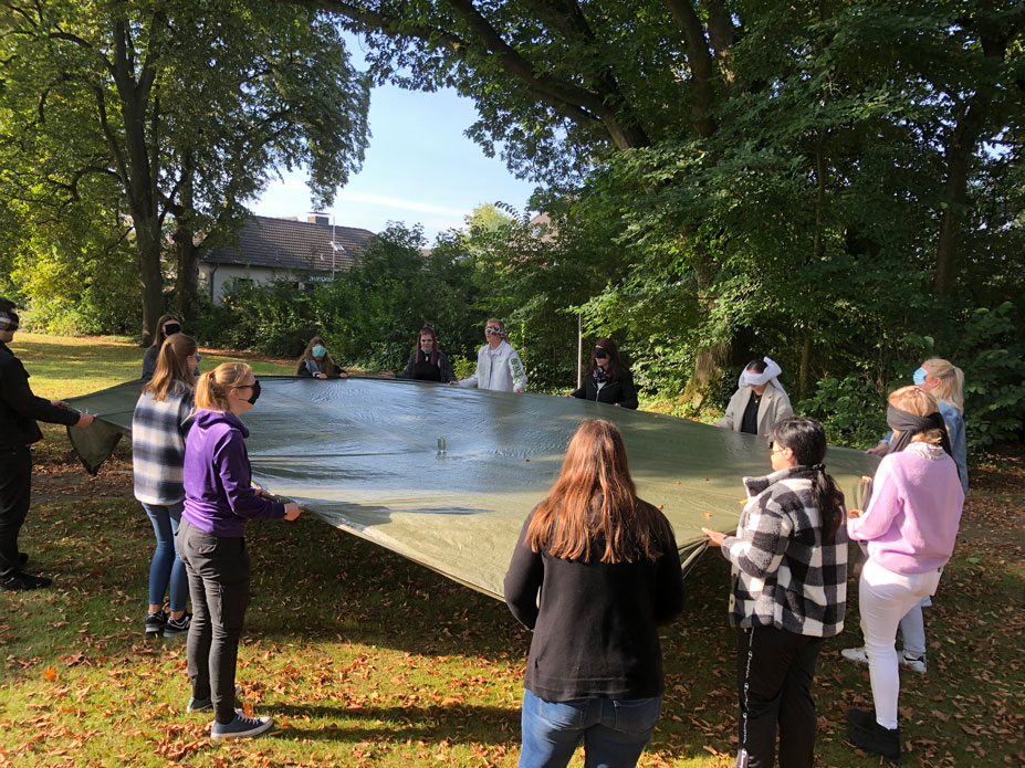 Nach dem theoretischen Teil ging es dann zum praktischen Teil über. Zunächst stellte uns Herr Scholz verschiedene erlebnispädagogische Spiele vor, welche wir selbst in der Gruppe durchführten. Dazu gehörte beispielsweise der Transport eines Wasserglases auf einer Plane mit der gesamten Gruppe. Die Schwierigkeit war, dass ein Teil von uns die Augen verbunden hatte und das Ziel bestand darin, dass das Wasserglas nicht umkippt. Danach entwickelten wir in Kleingruppen Spiele, die verschiedene Bereiche ansprechen sollten (Motorik, Kognition, etc.) und führten diese selber durch. So konnten wir uns auch in der Rolle der Anleiterin bzw. des Anleiters üben, die wir als HEP in der beruflichen Praxis einnehmen.