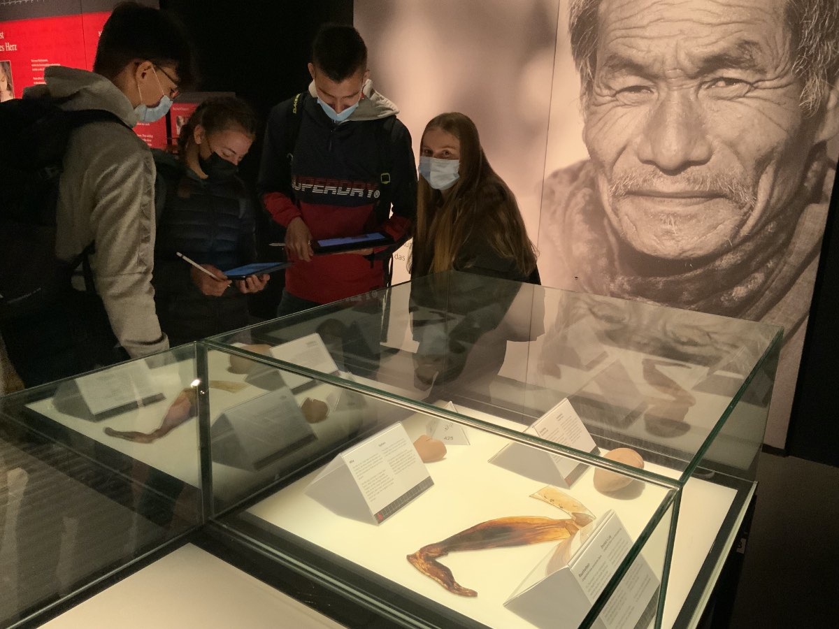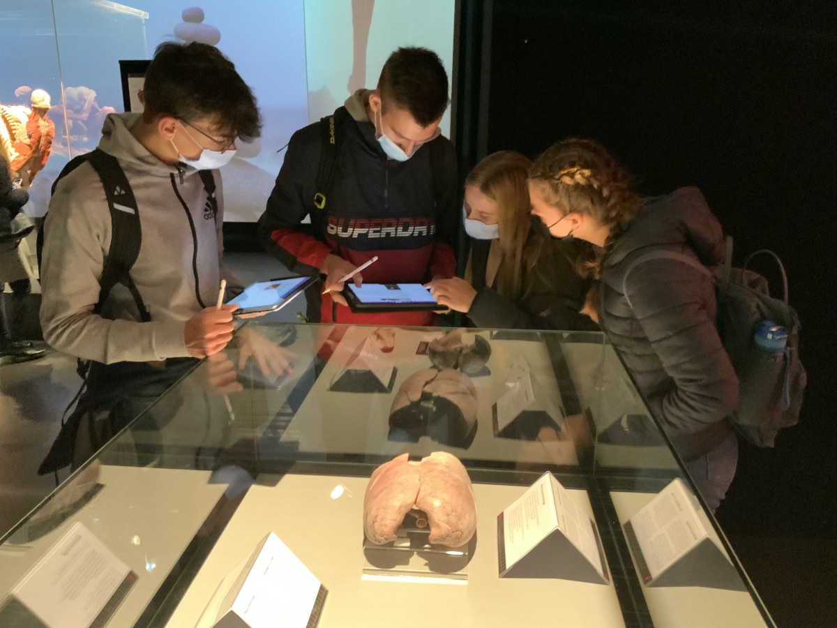 Nicht ziellos durchstreiften unsere Schülerinnen und Schüler die Ausstellungshalle. Vielmehr half ein umfangreicher, persönlich entwickelter bebildeter Beobachtungsbogen mit vielerlei interessanten Fragen, sich der Anatomie, der Physiologie und den vielen krankmachenden Prozessen des Menschen zu widmen. Nicht zuletzt die großen so genannten Plastinate, die Menschen in konservierter Form „in Aktion“ zeigten, erlaubten einen mehr als plastischen Einblick in das Zusammenspiel der einzelnen Organe und Gewebe. Menschen hatten noch zu Lebzeiten ihr Einverständnis zur Konservierung ihres Körpers nach ihrem Tod gegeben.