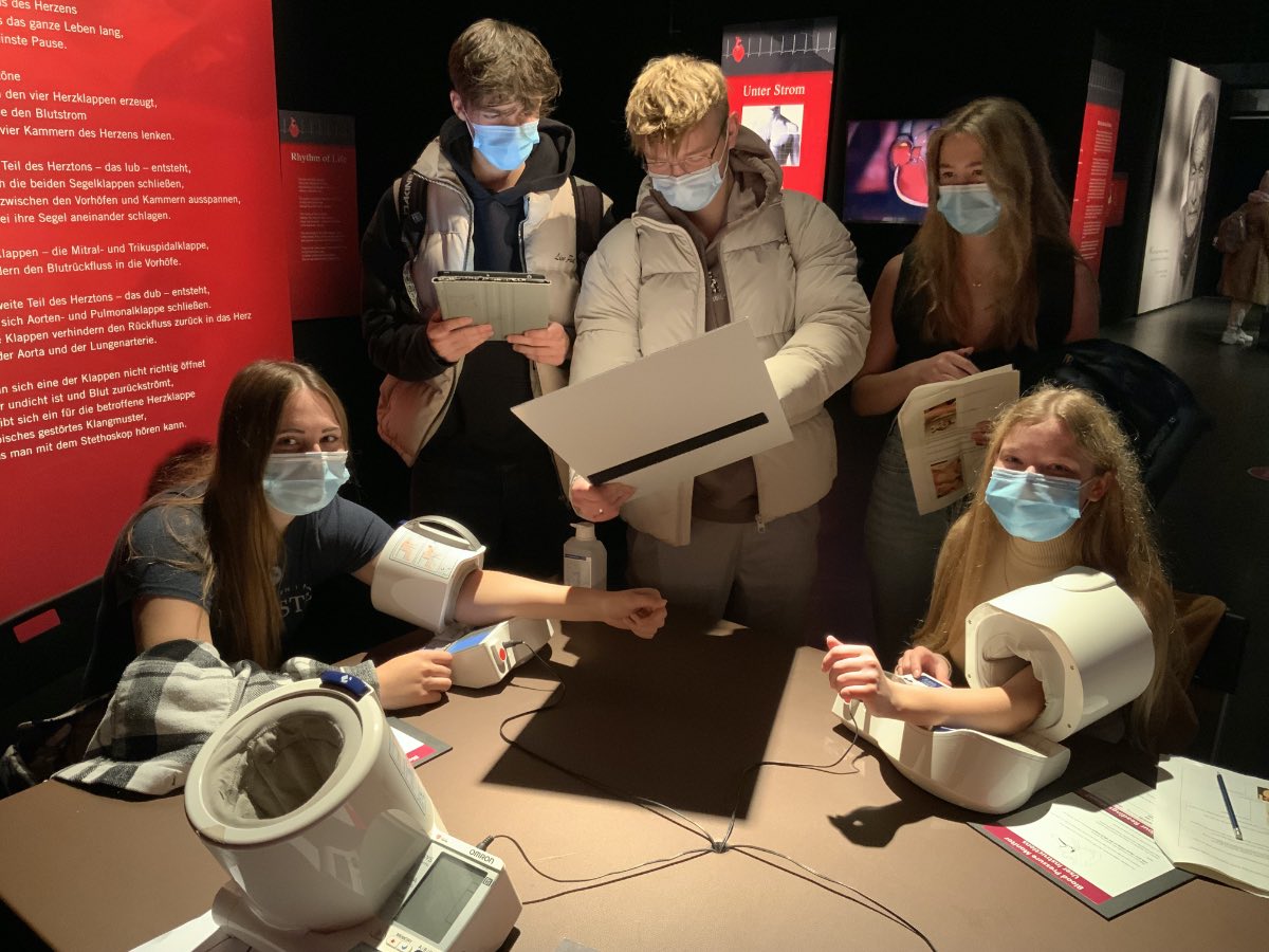 Dank der vielen Infotafeln und der Videos, die über Monitore zu sehen waren, wurde anschaulich verdeutlicht, wie der Körper funktioniert und sich der Lebenswandel wie z.B. Sport oder eine schlechte Ernährung positiv oder aber negativ bemerkbar macht. Gerade die Sportabiturienten und die Schülerinnen und Schüler aus dem LK Ernährungswissenschaft legten darauf ein Augenmerk. Alles das war natürlich mit vielen Fakten und Zahlen angereichert. Wer hätte z.B.gedacht, dass im Jahr rund 2,7 Mio. Liter Blut durch ein menschliches Herz gepumpt werden oder ein einziger Lungenflügel rund 400 Mio. Lungenbläschen besitzt, in denen der Gasaustausch stattfindet?