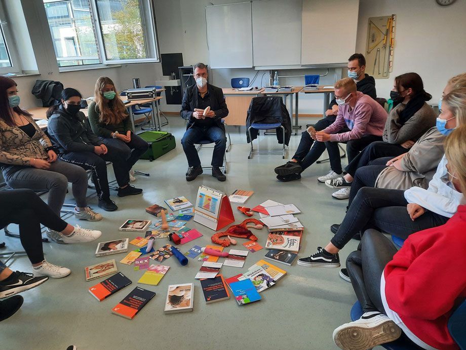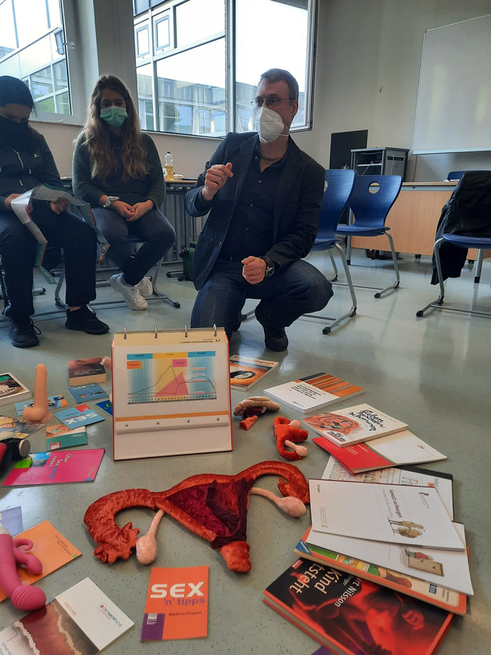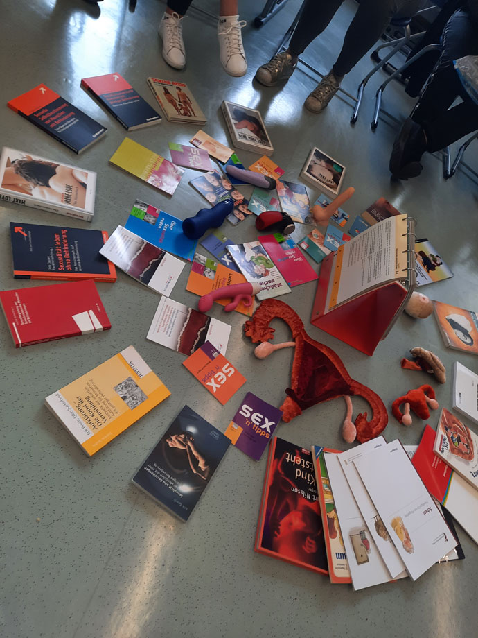 Um den sehr informativen Tag abzurunden, stellte Jan Pellens verschiedene Materialien, wie die PAOMI-Genitalien sowie Literatur zur Sexualberatung vor. In einem sehr anschaulich gestalteten Materialkreis durften wir aktiv und selbstwirksam die verschiedenen Materialien und die Literatur in Augenschein nehmen. Zudem erläuterte Herr Pellens die verschiedenen Funktionen und Beratungsmethoden.