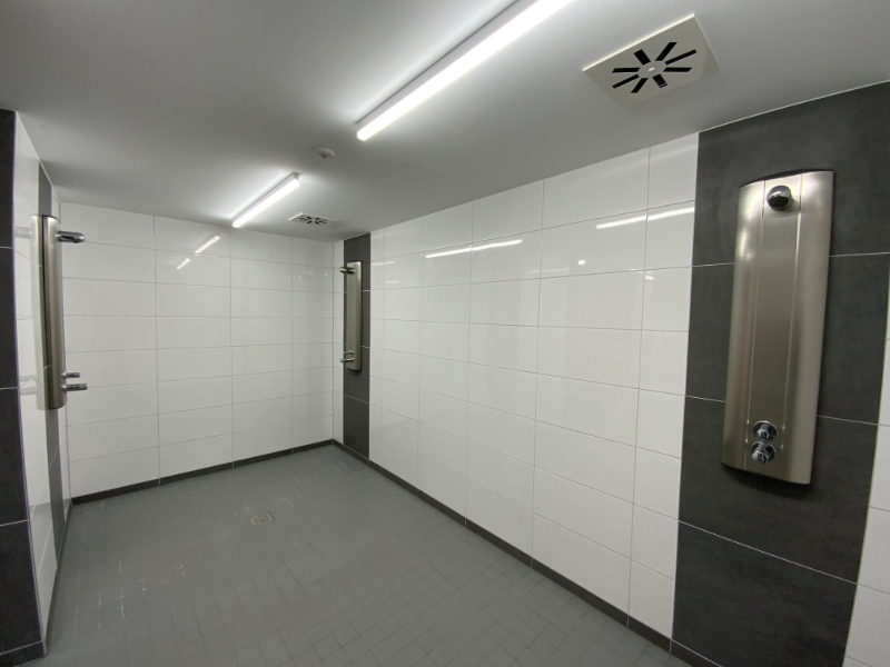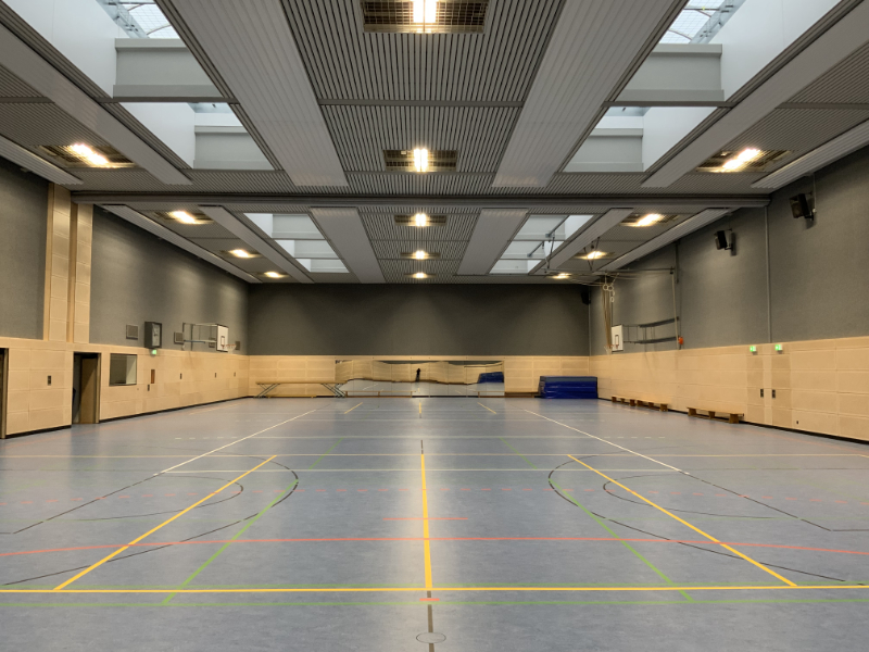 Fassaden-Dämmung, Heizung, Fenster und Türen, Beleuchtung und helle Deckenverkleidung, Wandverkleidung mit Prallschutz aus gelochtem Schichtholz in Behaglichkeit ausstrah-lenden, modernen Farben, ein komplett neuer Fußboden inklusive Unterkonstruktion, neue Kommunikations- und Beschallungstechnik mit Verbindungen via bluetooth, Umkleiden mit frischer Farbe, luxuriös anmutende Sanitäranlagen, großformatige Steinfliesen im einladenden Eingangsbereich und und und …