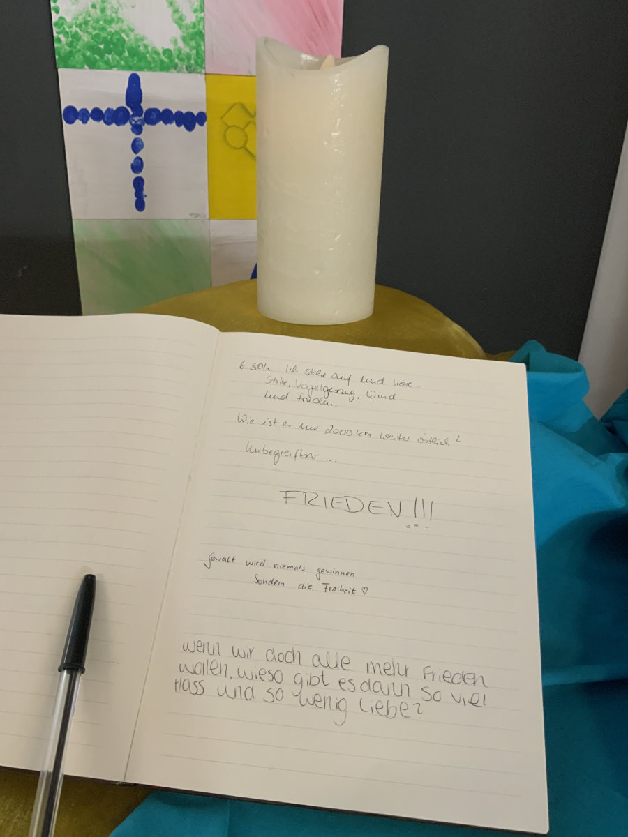 Und wer seinen Gefühlen zur derzeitigen Situation Ausdruck geben möchte, der hat hierzu auch Gelegenheit: nicht nur im Unterricht oder in der Hauskapelle, sondern auch an einem eigens in den Farben der Ukraine gestaltete Stehtisch im PZ, auf dem ein Buch ausliegt, in das persönliche Gedanken niedergeschrieben werden können.