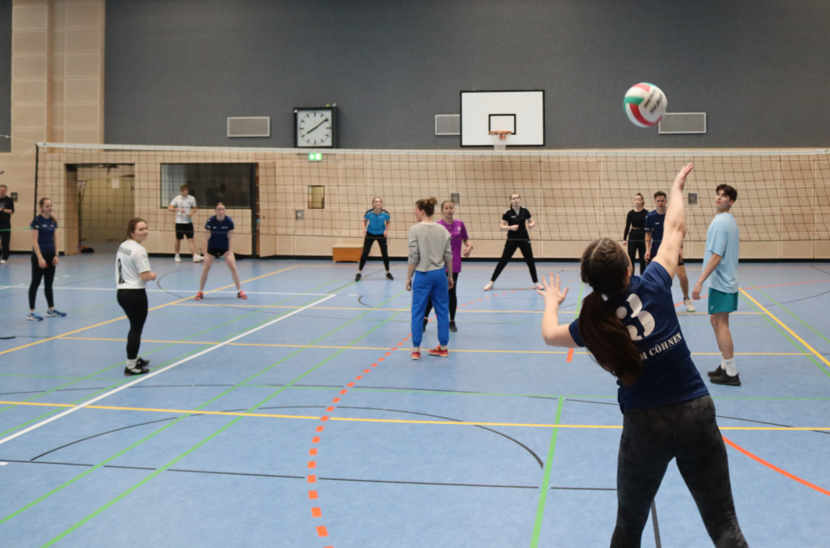 Die Sportabiturienten aus der AH/13F und AH/12F wollten dennoch nicht ganz auf einen sportlich-fairen Wettkampf verzichten. In der letzten Woche vor den Osterferien trafen sie sich nachmittags in der Halle – nicht allerdings um zu zeigen, welche Klasse die besseren Volleyballer in ihren Reihen hat. Vielmehr teilten sie sich sportlich fair in acht Gruppen ein, die alle in etwa auch zahlenmäßig gleich besetzt mit Jungen waren, um dann im Wettkampfmodus gemeinsam vor allem Spaß zu haben.