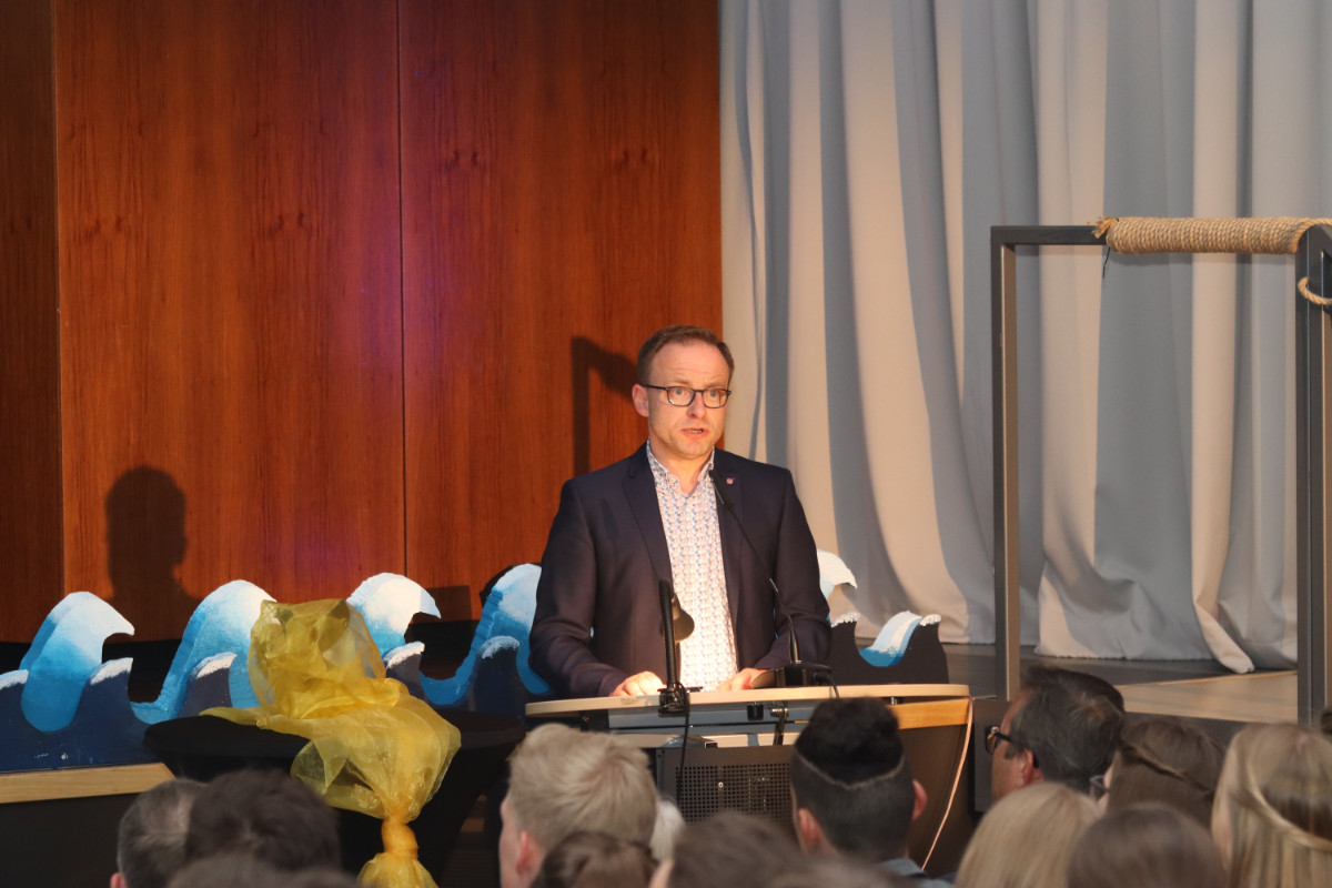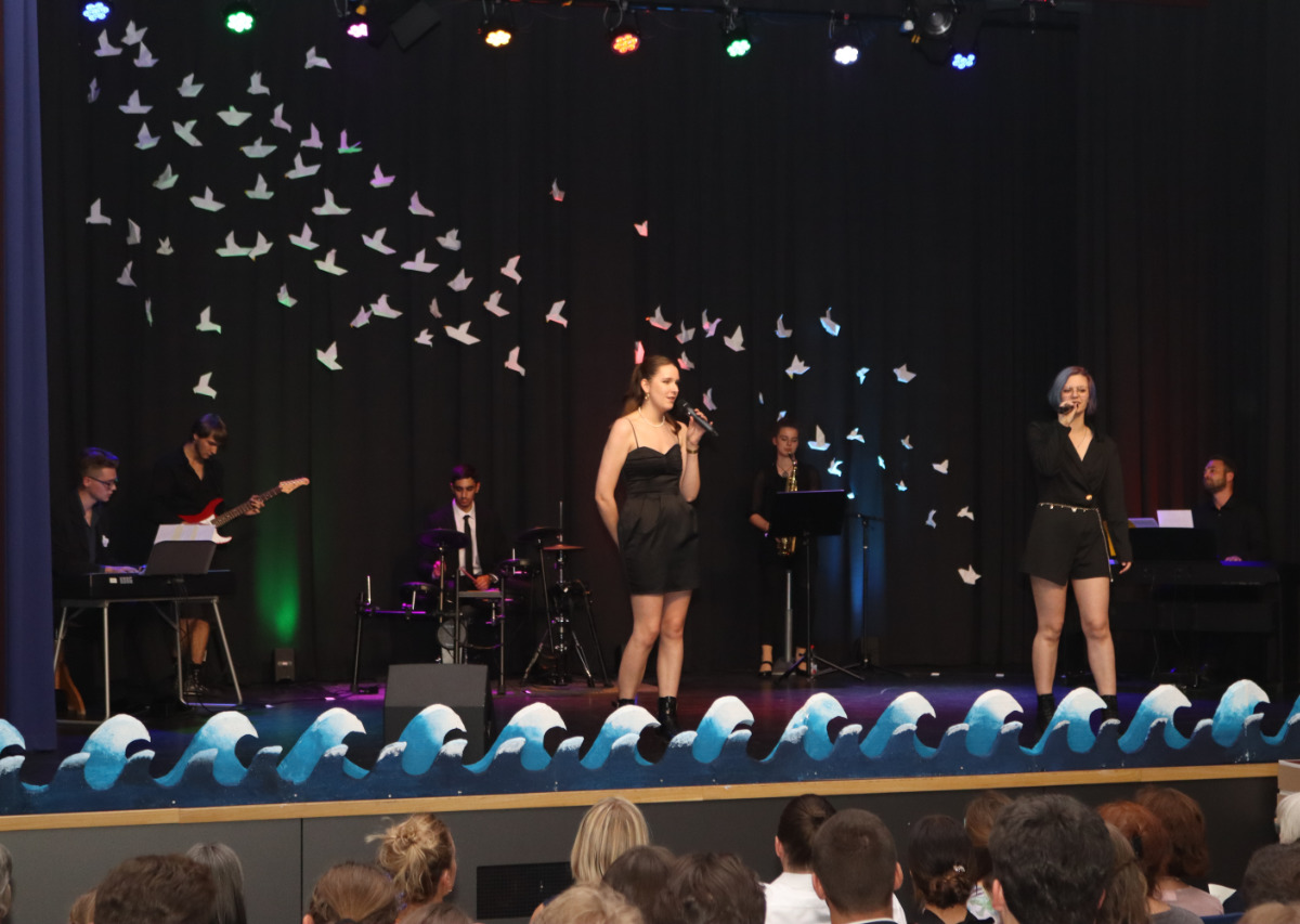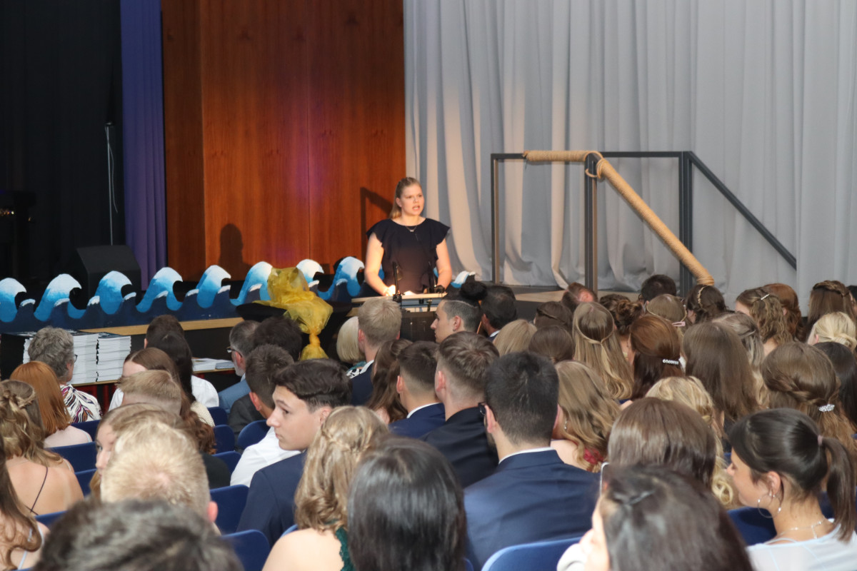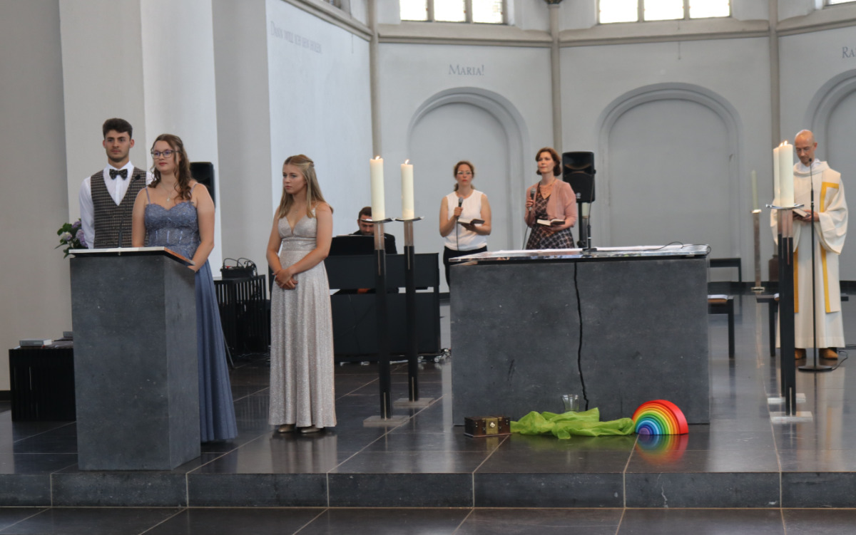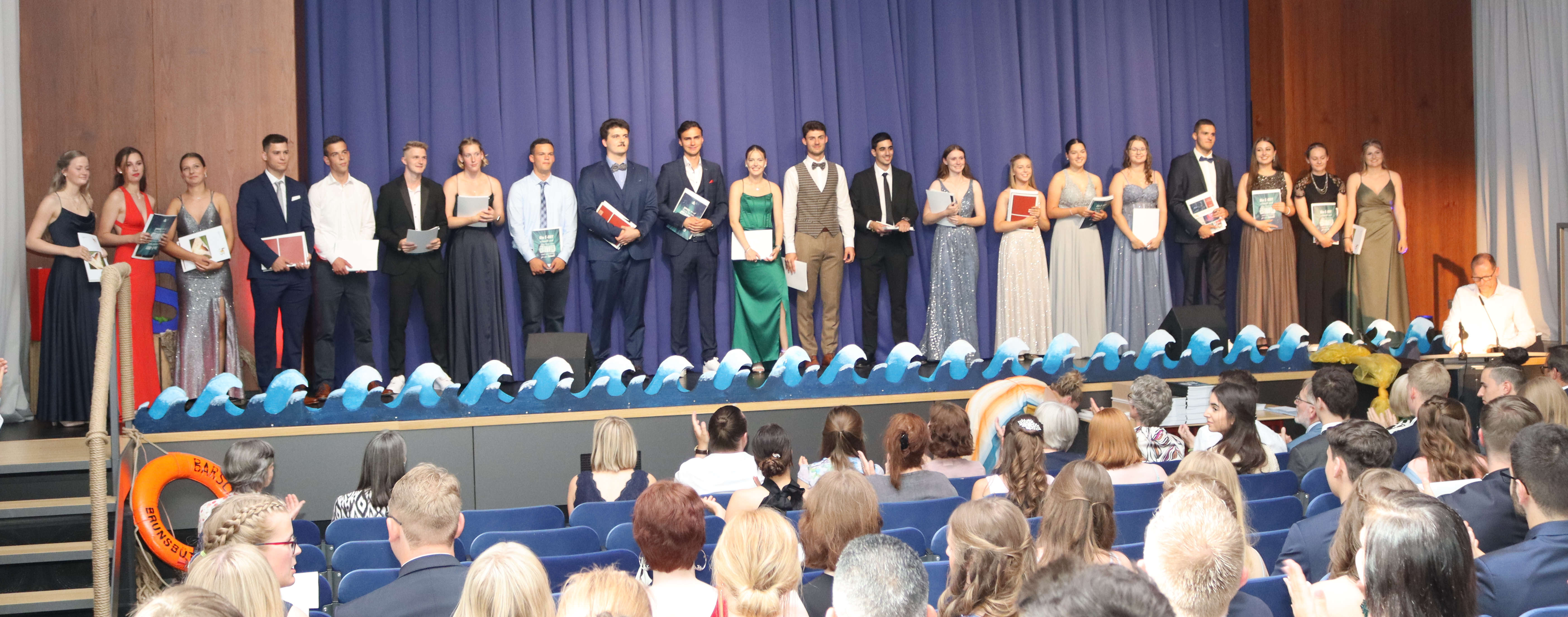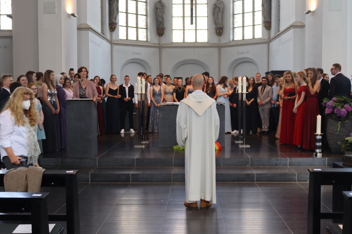 Endlich! Zwei Jahre lang hatte es wegen Corona keine großen Entlassfeiern mit Eltern in einer vollbesetzten Aula gegeben. Doch nun war es wieder möglich! Gleich drei Mal wurden je nach Bildungsgang insgesamt mehr als 300 Schülerinnen und Schüler sowie Studierende der Fachschulen mit der Ausgabe der Zeugnisse verabschiedet. Bei jeder Feier gab es ein schönes Bühnenprogramm. Zuvor feierten die Entlassschüler und deren Gäste, zumeist die Eltern, einen Wortgottesdienst in der Pfarrkirche.
