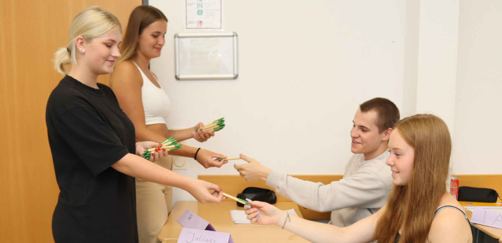 Die neuen Klassen bekommen immer sehr viel Neues zu sehen und zu hören, wenn sie Teil unserer Schulgemeinschaft werden. In diesem Jahr haben sie zusätzlich noch Besuch vom Fairtrade-Schulteam bekommen. Schülerinnen und Schüler des Schulteams sind zu Beginn des Schuljahres in alle neuen Klassen gegangen, um darüber zu informieren, dass sich unsere Schule nicht nur für die Schulgemeinschaft und nähere Umgebung interessiert und einsetzt, sondern auch das Wohl der Menschen im globalen Süden fördern möchte. Wie das geht? Mit fair gehandelten Produkten, die es nun an unserer Schule gibt und geben wird. Denn einen fairen Lohn wünscht sich jeder! Alle neuen Schülerinnen und Schüler haben einen Kugelschreiber geschenkt bekommen, der darauf aufmerksam macht, dass wir weiterhin Unterstützung brauchen, um Fairtrade-School zu werden.