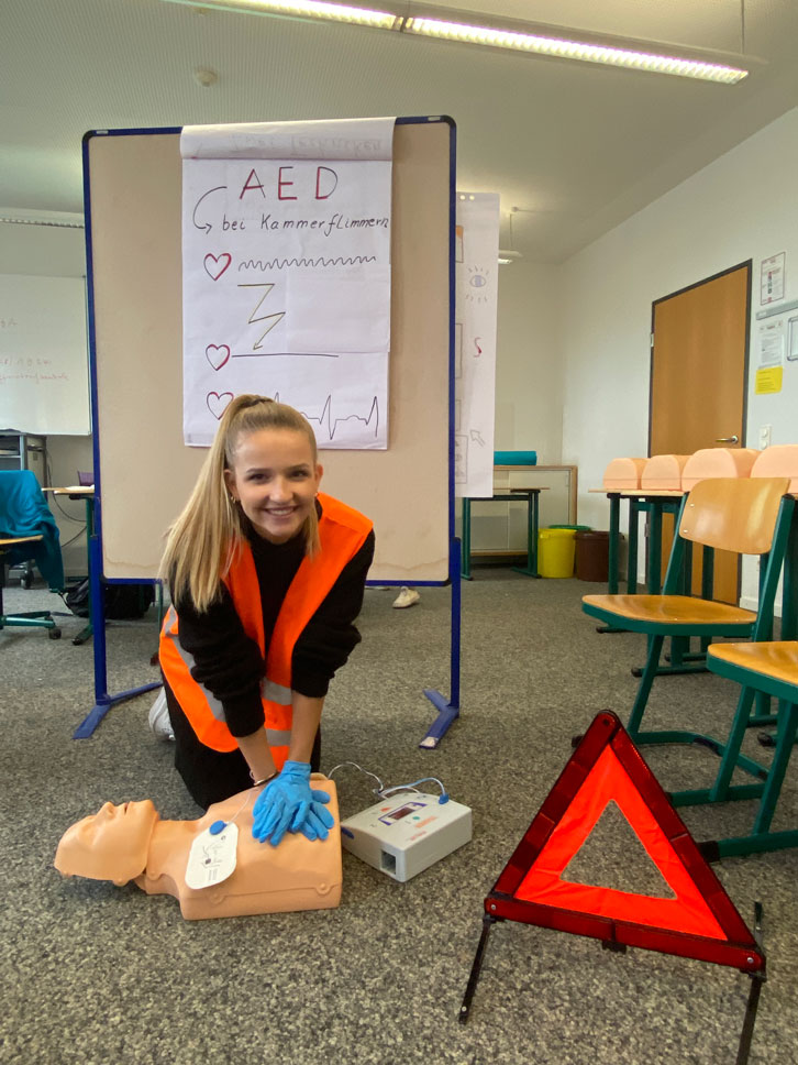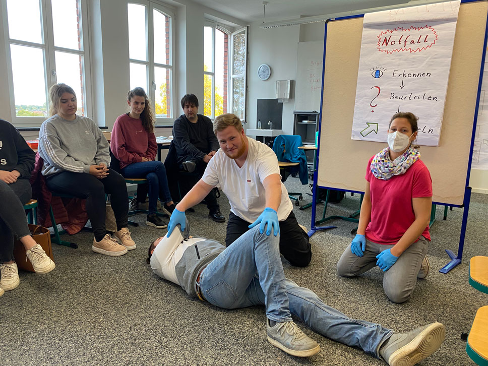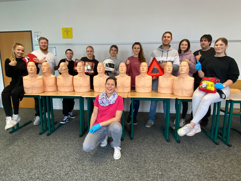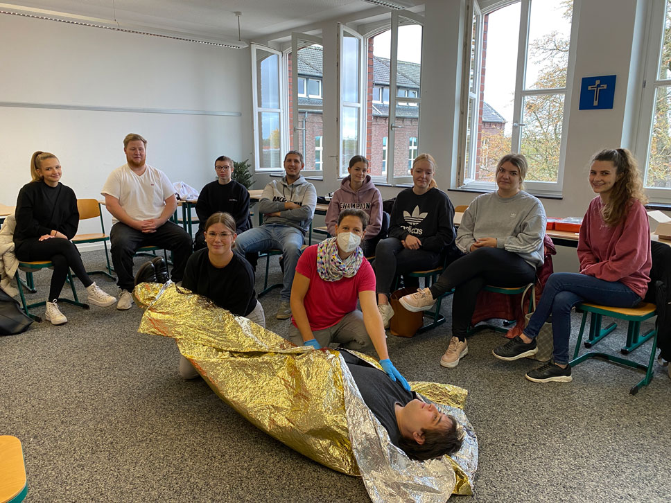 Die Studierenden der Unter- und Oberstufe der Fachschule für Heilerziehungspflege sind dank Frau Rickers, Lehrerin und Malteser-Dozentin, in Sachen Erste-Hilfe auf dem neuesten Stand.