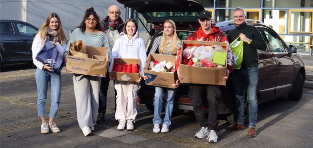 Zwei Wochen lang standen unter einer Infotafel Kartons bereit, die in jenen Tagen auch eifrig gefüllt wurden. Abgeholt wurden sie von unserem ehemaligen Kollegen Hubertus Heix (im Foto 3. von links), dem Sprecher der Steuergruppe Fairtrade-Stadt Geldern. Er bedankte sich ausdrücklich für das Engagement unserer Schülerschaft.