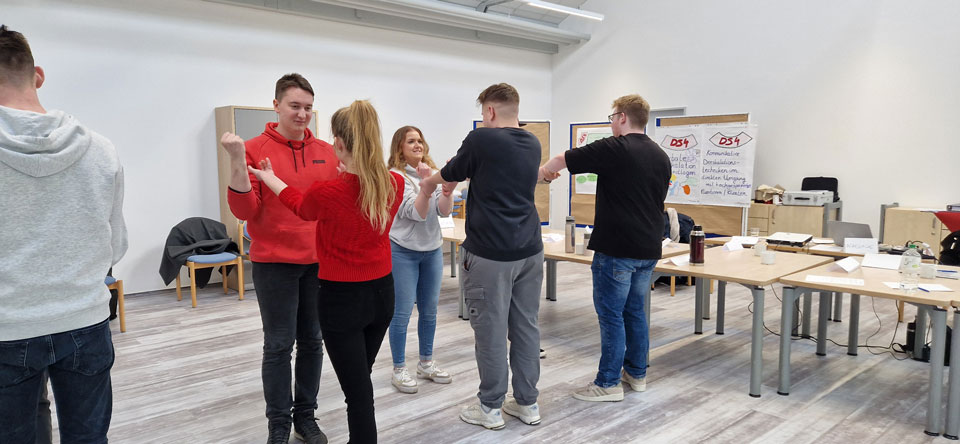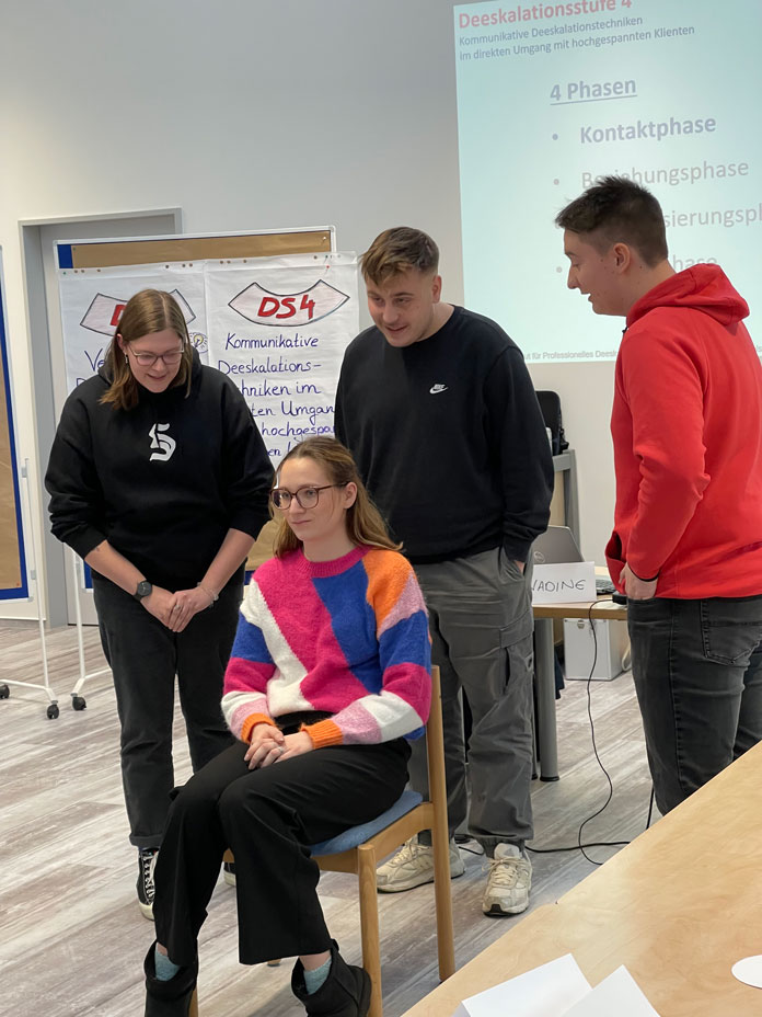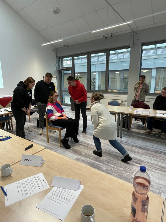 Wie wir lernten, umfasst dieses Deeskalationsmanagement insgesamt sieben Deeskalationsstufen, für die wir in den beiden Tagen der Reihe nach sensibilisiert wurden und zu denen wir angemessene Verhaltensweisen erlernten, die wir als Heilerziehungspfleger/innen bestenfalls eines Tages, so der Bedarf besteht, zum Einsatz bringen können. Um dies zu können, beließen es die Referentinnen nicht bei theoretischen Ausführungen, sondern gaben uns immer auch die Möglichkeit, uns in Rollenspielen praktisch zu erproben. Auch hatten wir dank der offenen Gestaltung des Seminars immer wieder Gelegenheit, in den Austausch über unsere eigenen Erfahrungen mit vergleichbaren Situationen in der beruflichen Praxis zu gehen.