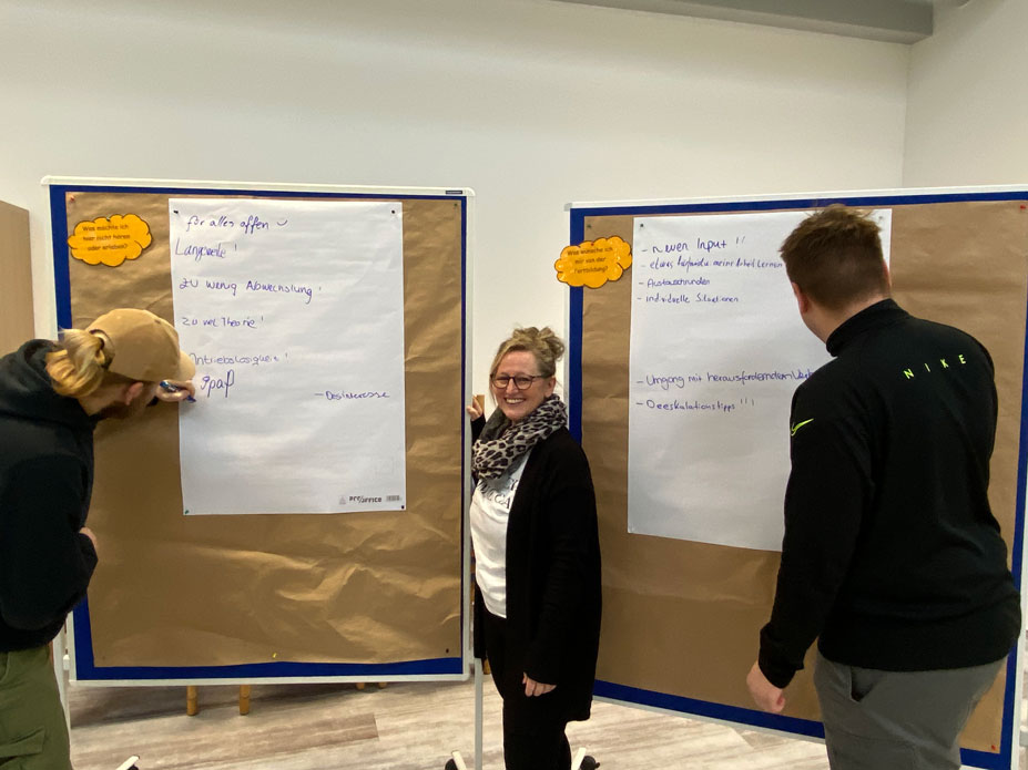 Insgesamt konnten wir am Ende der beiden Tage viel besser nachvollziehen, wie es beispielsweise zu solchen Situationen kommt, sind sensibler dafür, wann Situationen einer Intervention im Sinne der Deeskalation bedürfen, kennen zudem geeignete Deeskalationsmaßnahmen und können dank unserer Übungen auch einige davon anwenden. Es war eine sehr lehrreiche und praxisnahe Fortbildung! Danke für einen anderen und verständnisvolleren Blick in der alltäglichen Arbeit mit Menschen mit herausfordernden Verhaltensweisen!