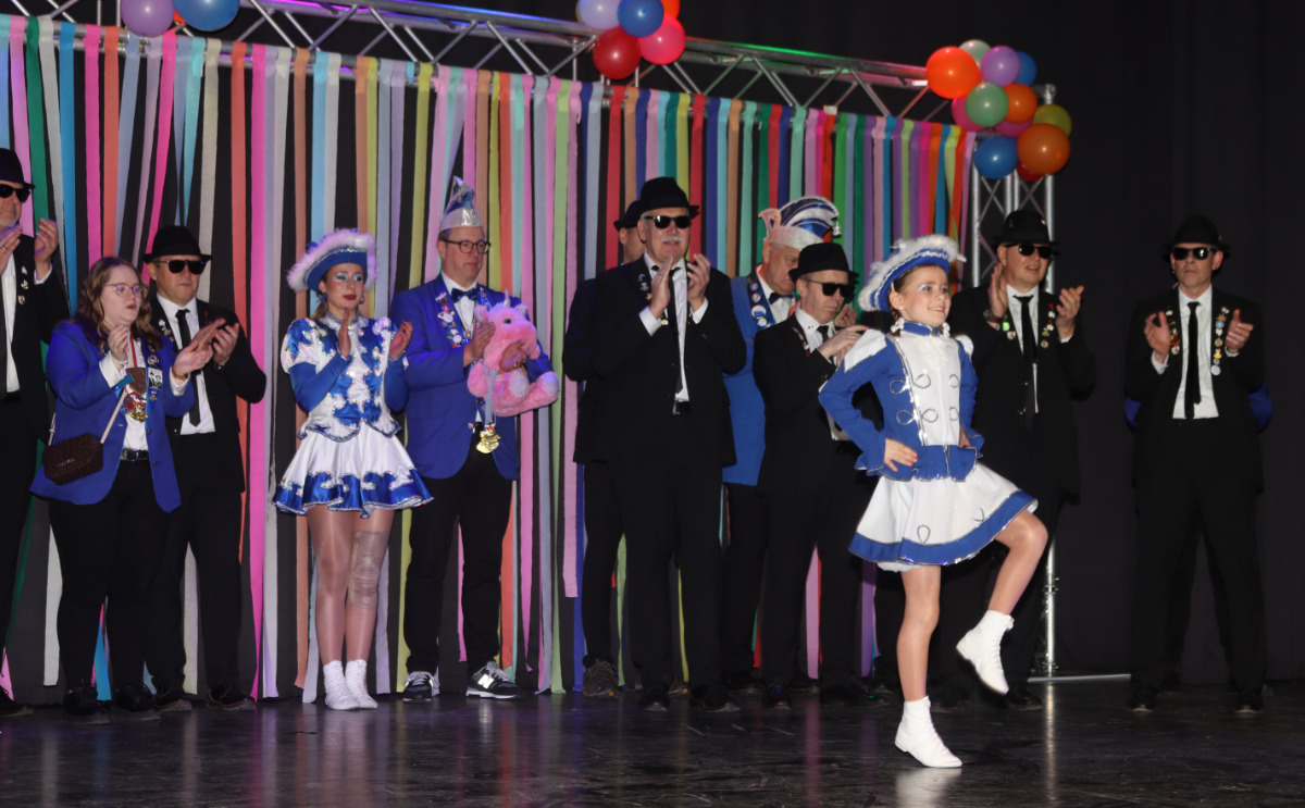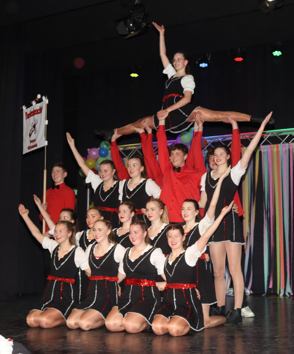 Aber auch zwei außerschulische Highlights kurbelten die gute Stimmung an und ließen so manchen aufgrund der Akrobatik staunen: der Hartefelder Prinz, der mit seinen Blues-Jecken (unter anderem unserem Hausmeister Herrn Flöhr) und den beiden Funkenmariechen (Tochter und Nichte vom Hausmeister!) angereist war sowie die Wachtendonker „Funkenkracher“. Uiuiui – so beweglich müsste man sein und dann noch soviel Mut für halsbrecherische Kunststücke in luftiger Höhe haben!