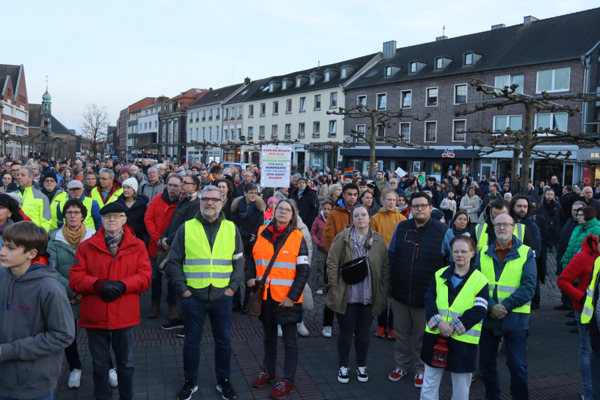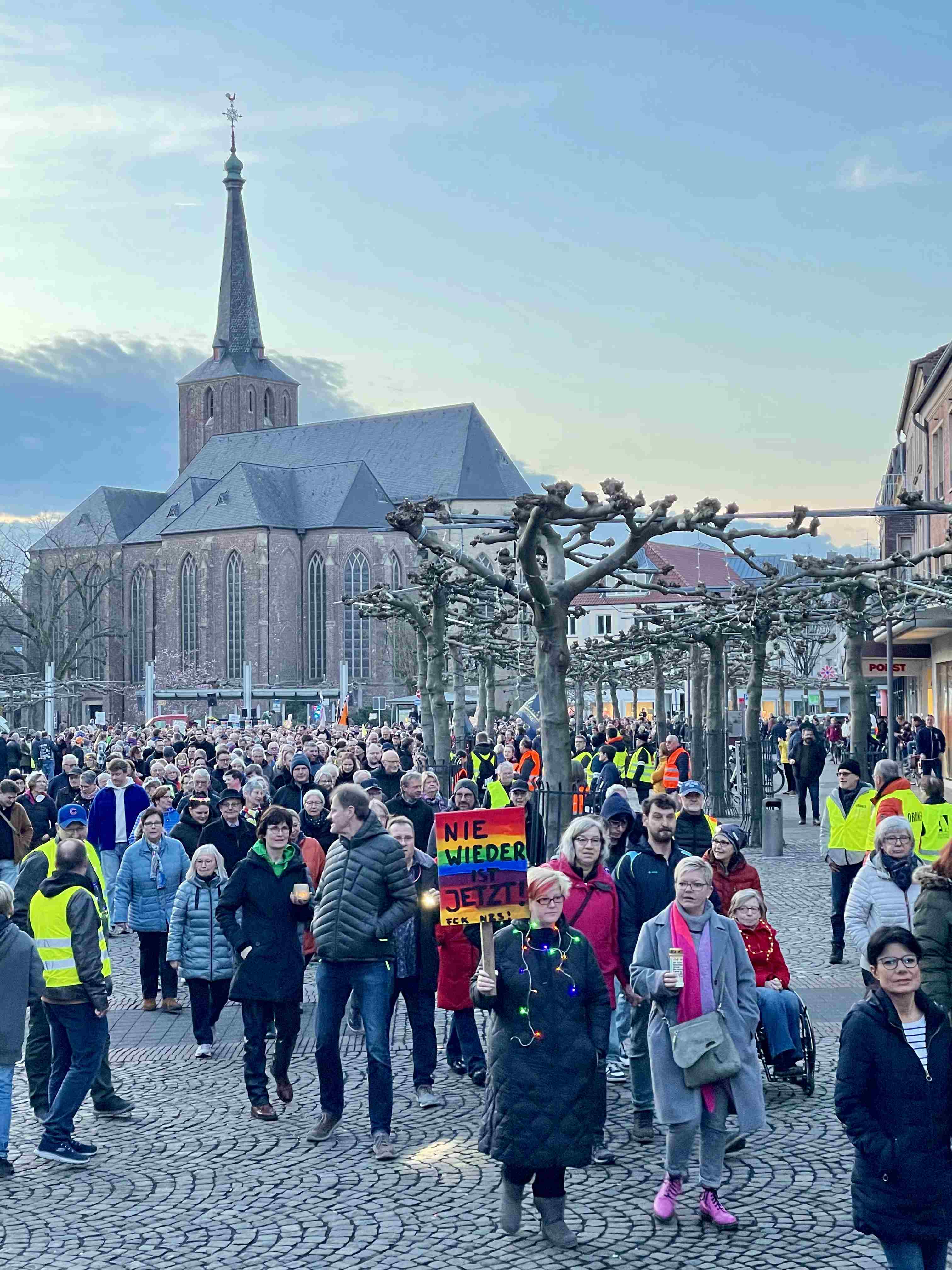 Waren es 1500 bis 2000 Teilnehmer, wie die Polizei meldete, oder doch sogar annähernd 3000 Menschen, wie aus einem Veranstaltermund zu hören war? Das lange Lichtermeer, das sich am 3. März ausgehend vom Marktplatz über die Gelderner Wälle prozessionsartig erstreckte, war in jedem Fall ein überzeugendes Zeichen für Demokratie, für Frieden und gegen Rassismus. Auch wir als Schule beteiligten uns aktiv an dieser bunten Lichter-Demonstration, zu der die Gelderner Parteien (außer der AfD), die Kirchen und Wohlfahrtsverbände, Gewerkschaften und Vereine und eben auch wir als Liebfrauenschule und die benachbarte Realschule aufgerufen hatten.