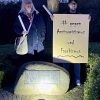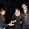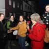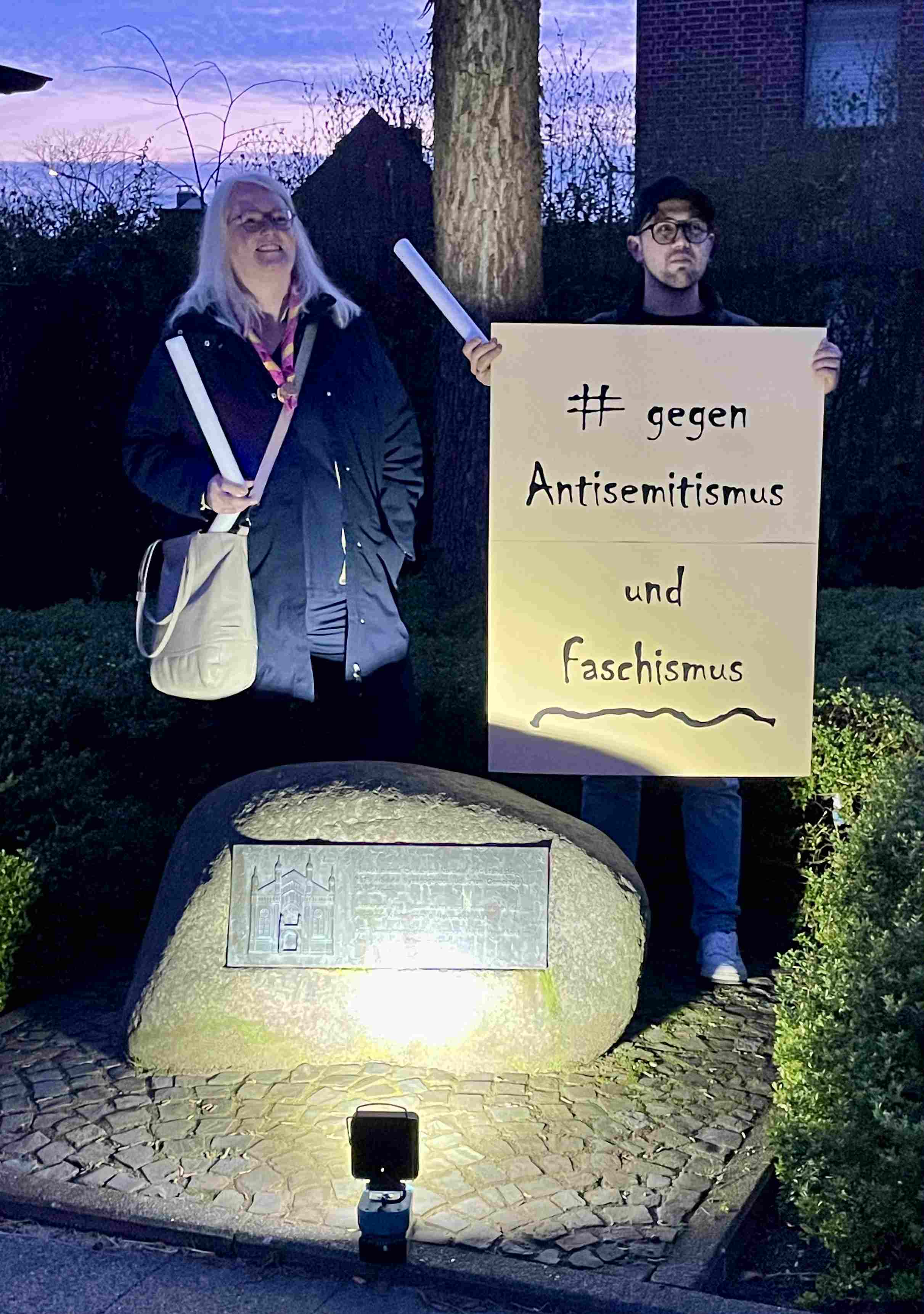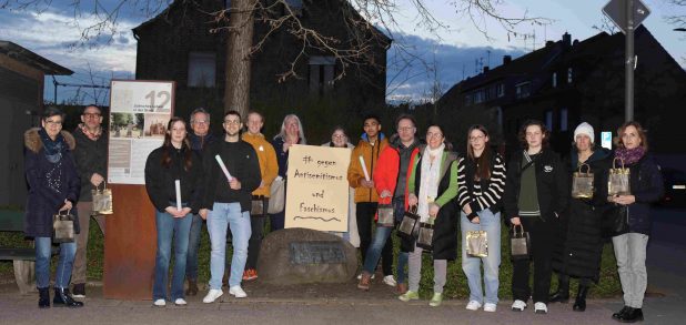 Gleich vier Stationen auf der langen Marschroute luden mit einem Impuls zum Nachdenken und Besinnen ein. Einen davon gestalteten wir als Liebfrauenschule auf dem Nordwall. An der Stelle, an der bis zur Reichspogromnacht 1938 die von den Nazis niedergebrannte Synagoge stand, verteilten Schülerinnen und Schüler als Gedenken an die Opfer des Nationalsozialismus die so genannten „Stolpersteine“ in Papierform. Flankiert wurden sie dabei durch zahlreiche Laternen, die ebenfalls als Motiv einen Stolperstein trugen. Zeitgleich wurde an der Gedenktafel, die an die Synagoge erinnert, eine Mahnwache gehalten.