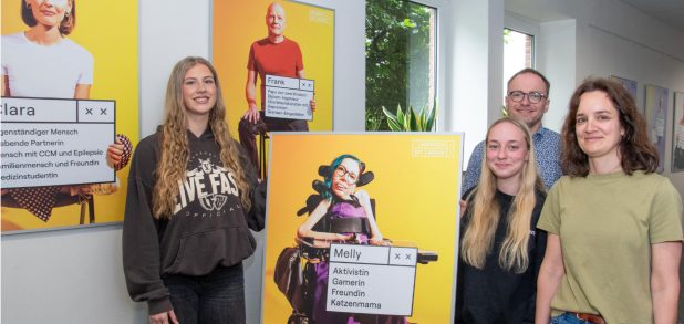Dass Max mit Trisomie 21, auch bekannt als Down-Syndrom, geboren wurde, sieht man ihm auf den ersten Blick nicht an. Und auch auf dem Zettel, den er auf dem großformatigen Foto in die Kamera hält, steht nichts von seiner Behinderung. „Familienmensch“ und „Freund“ ist er, „Sportler“ und „Verwaltungsangestellter“. Die drei Studierenden Lea Wenig (19), Johanna Schwitalla (21) und Jana Dams (19) bleiben an dem Plakat stehen. „Seine Behinderung spielt für das Selbstbild von Max einfach keine Rolle“, betont Johanna Schwitalla.