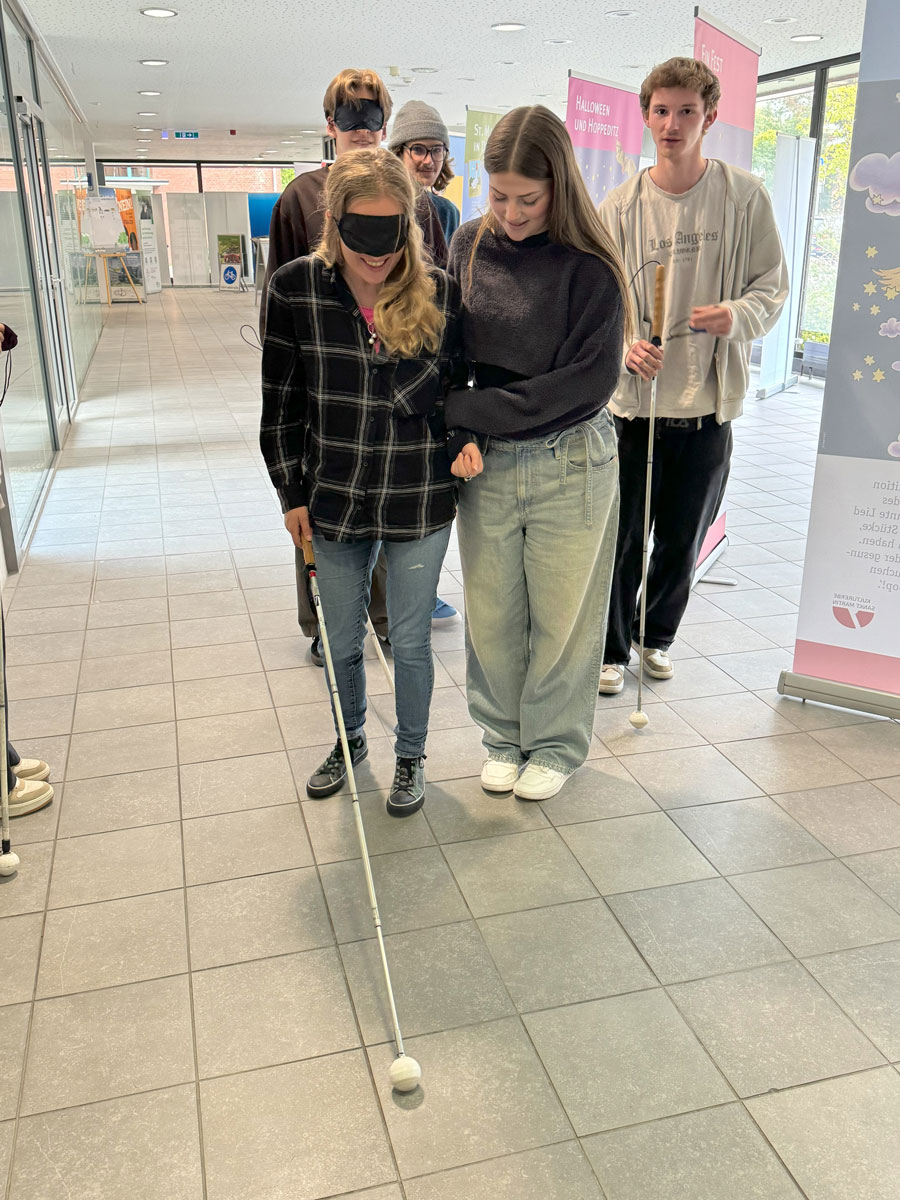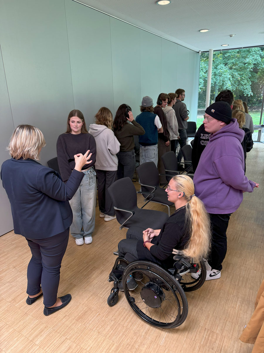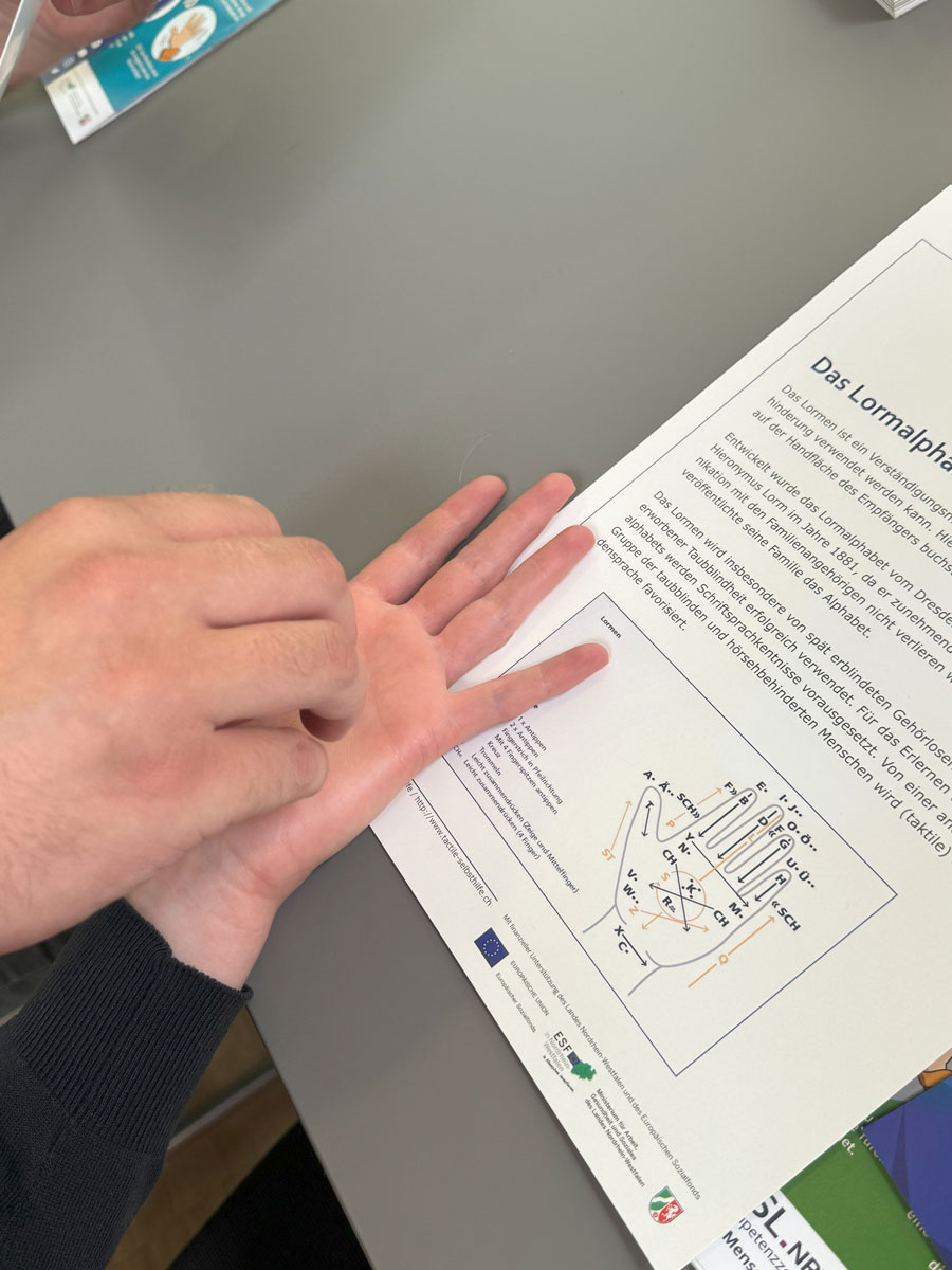Auf all diese Fragen konnten unsere Studierenden der Heilerziehungspflege-Unterstufe im Rahmen einer Sensibilitätsschulung (SensiPro) unter Leitung von Betroffenen des Kompetenzzentrums Selbstbestimmtes Leben NRW Antworten finden. Eingeladen hatte hierzu die Stadt Geldern im Rahmen der Europäischen Mobilitätswoche. Neben vielen Fakten und Informativem begeisterten vor allem die praktischen Übungen mit Langstock, Simulationsbrillen, Kopfhörern, zu Gebärdensprache inklusive Lorm-Alphabet.