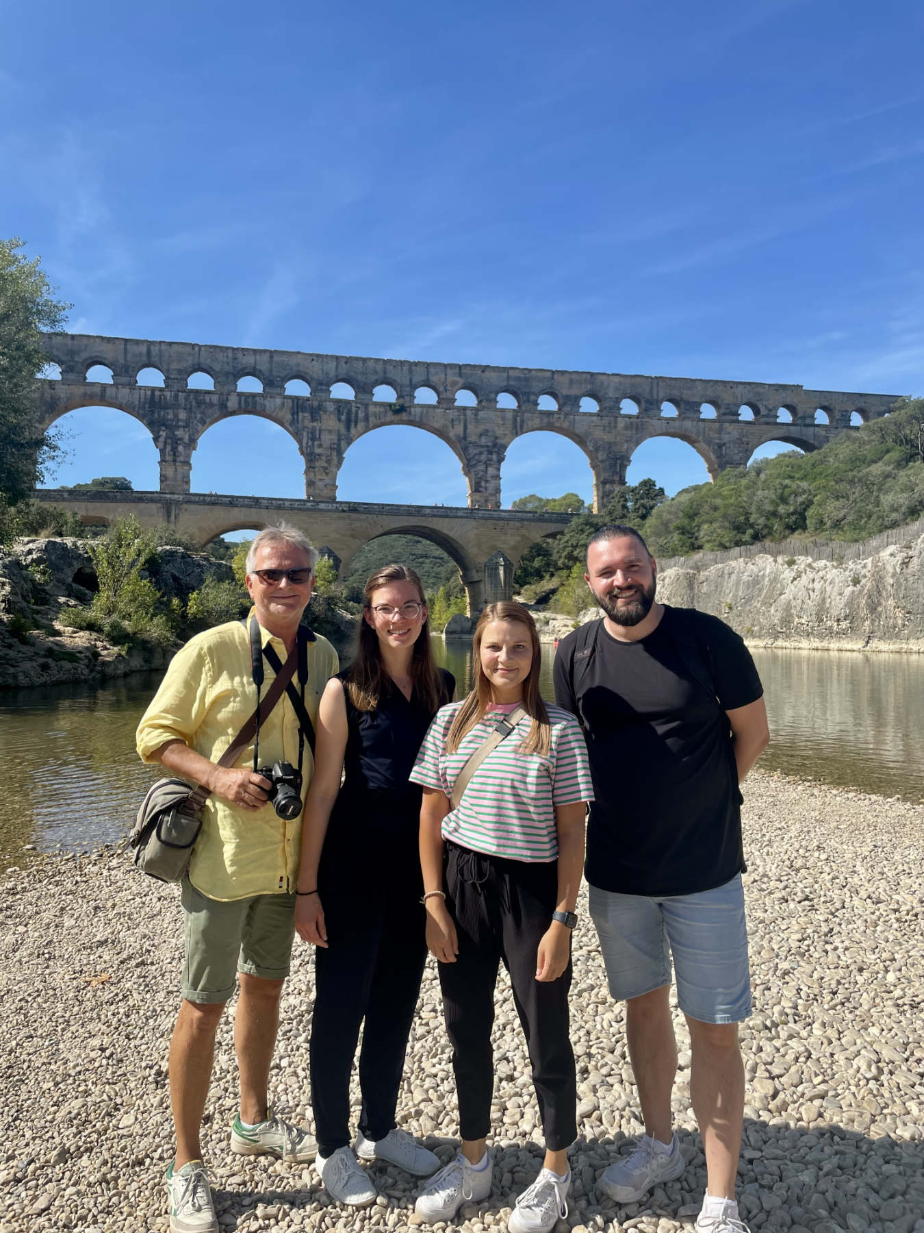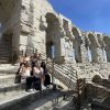 Rund 2000 Jahre zurück versetzte uns der Montag. Wir wandelten auf den Spuren der Römer! Als erstes fuhren wir zum von den Römern in landschaftlich reizvoller Lage erbauten Pont du Gard, einem rund 50m hohen und ca. 275m langen Aquädukt über den Fluss Gardon, dem ersten UNESCO-Welterbe, das wir sahen und vor dem wir unser erstes Gruppenfoto geschossen haben.