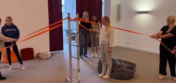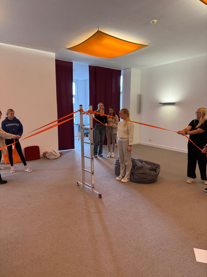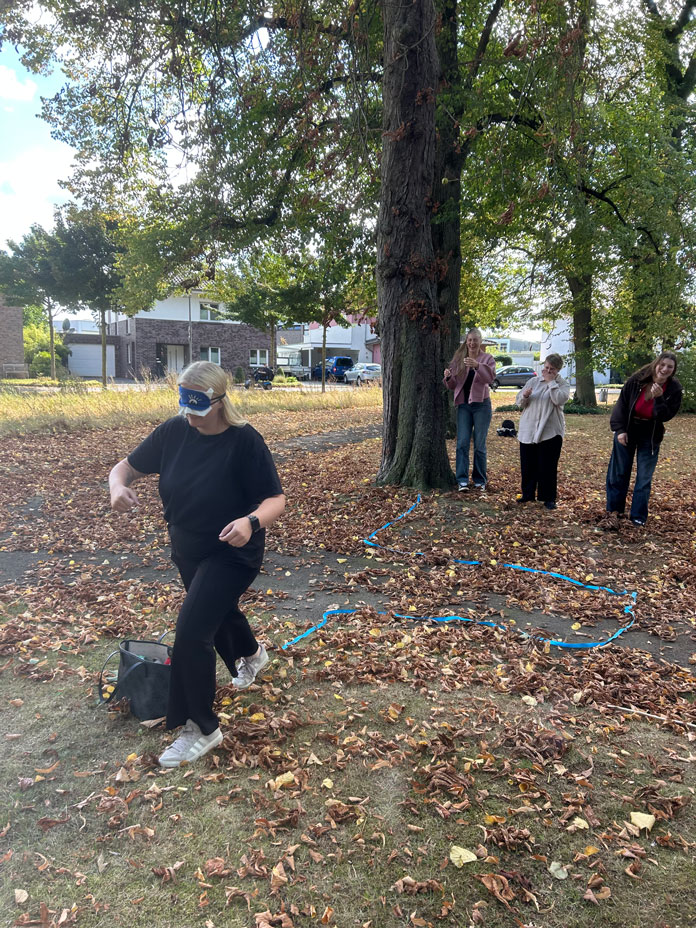 • Gruppe 1 plante einen Parcours, bei dem die Teilnehmenden sich an den Händen hielten und gemeinsam über ein Seil oder Hindernis steigen mussten. Mit verbundenen Augen wurde es noch spannender: Nur eine sehende Person durfte Anweisungen geben. Vertrauen war hier der Schlüssel.