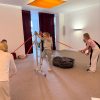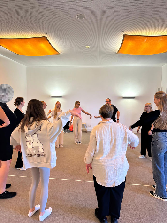Anschließend folgte das Würfelspiel, das Kognition, Merkfähigkeit und Kreativität förderte. Jede gewürfelte Zahl stand für eine vorher erfundene Bewegung, die die gesamte Gruppe mitmachen musste. Mit jedem Wurf wurde es komplexer und herausfordernder, sich die Bewegungen zu merken und schnell gemeinsam umzusetzen. Dabei wurde spürbar, wie flexibel Erlebnispädagogik sein kann: Bewegungen lassen sich leicht anpassen, sodass wirklich alle mitmachen können.