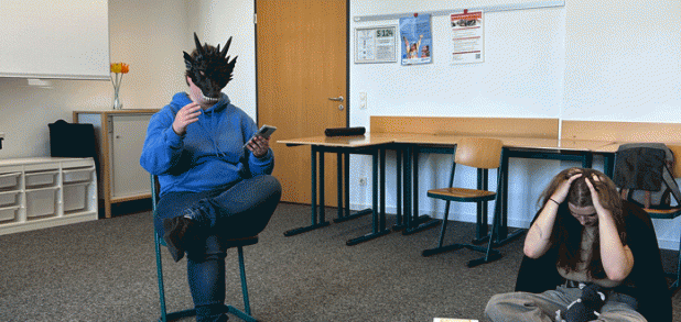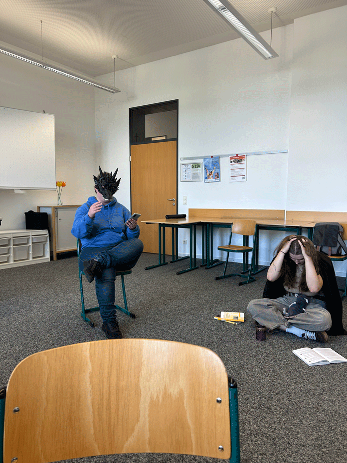 Im Anschluss tauchten wir direkt in die Praxis ein. Wir bewegten uns frei durch den Raum, spielten mit Körpersprache, wechselten Emotionen, schlüpften in unterschiedliche Rollen und arbeiteten mit Requisiten, die wir bewusst zweckentfremdet nutzten. Schnell wurde klar, wie viel Ausdruckskraft in kleinen Gesten, Haltungen oder Blicken steckt. Die Übungen ließen uns nicht nur über uns selbst staunen, sondern führten auch dazu, dass wir als Gruppe enger zusammenrückten und mutiger wurden, Neues auszuprobieren.