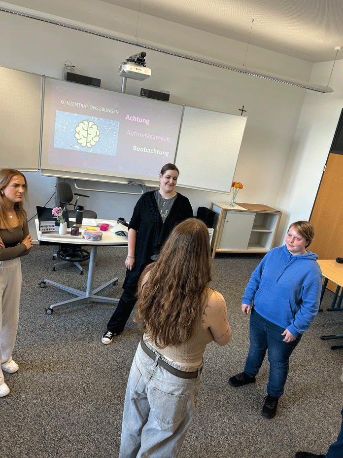 Zu Beginn erklärte uns Frau Hassels, welche Haltung eine Spielleitung im Theater einnimmt. Dabei ging es nicht nur um Methoden, sondern vor allem darum, wie wir Menschen begegnen: offen, wertschätzend und aufmerksam. Viele von uns erkannten sofort, wie eng diese Haltung mit unserem zukünftigen Beruf in der Heilerziehungspflege verknüpft ist.