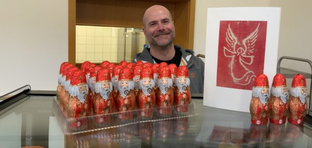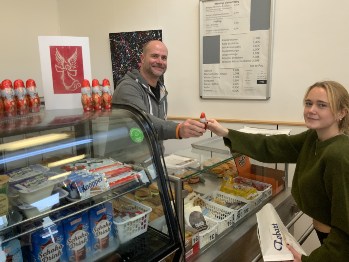 Passend zum Nikolaustag verkauften daher unsere Schulsozialarbeiterin Anne Buschkamp und unser Hausmeister Herr Flöhr fair produzierte und -gehandelte richtige Nikoläuse, die sie über den Eine-Welt-Laden in Geldern und damit über die GEPA, die Gesellschaft zur Förderung der Partnerschaft mit der Dritten Welt, bezogen hatten.