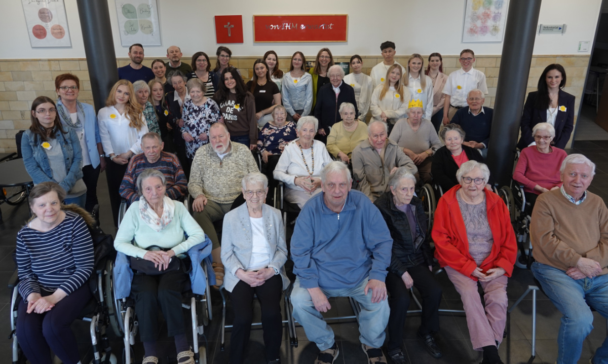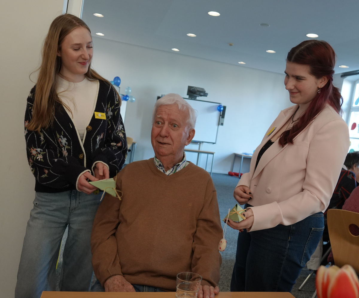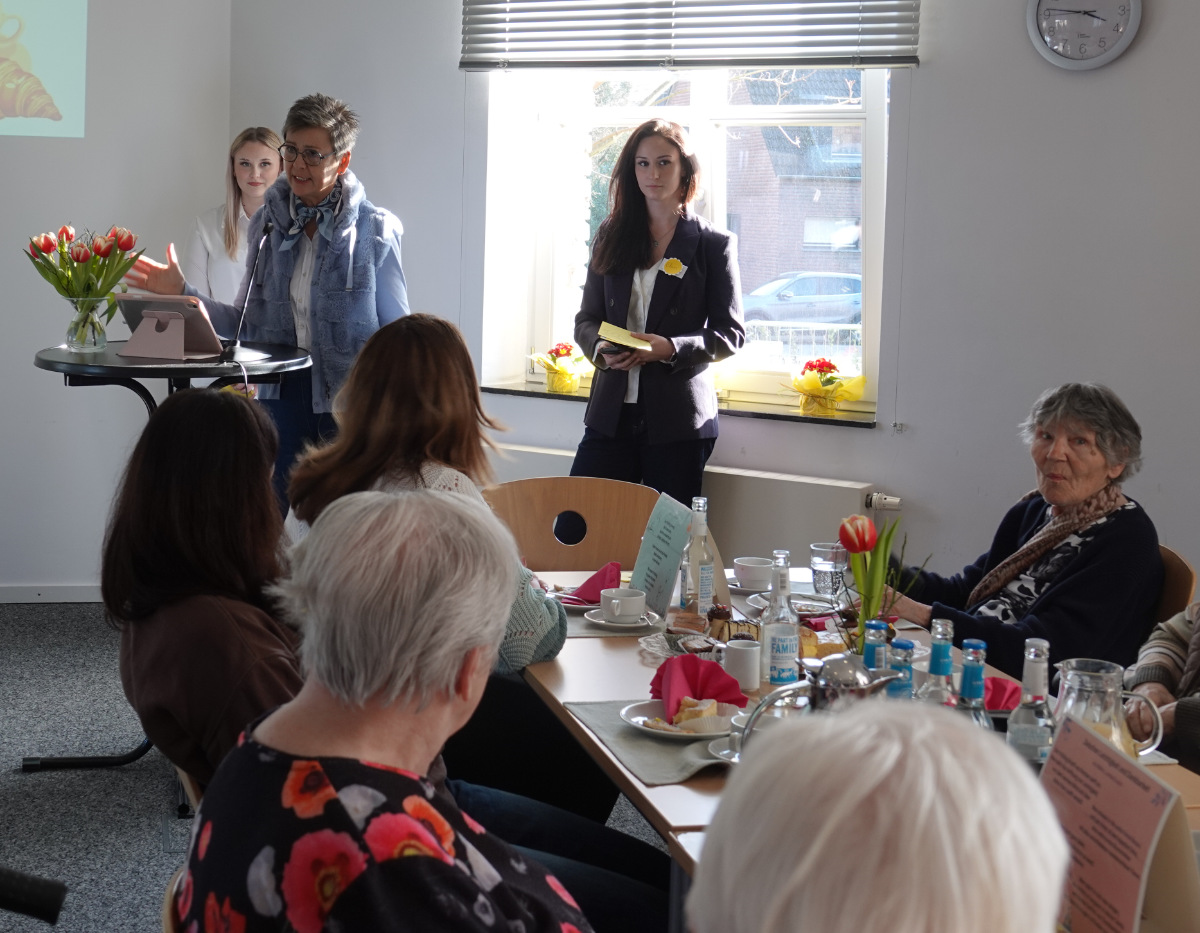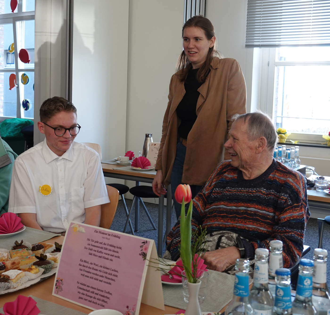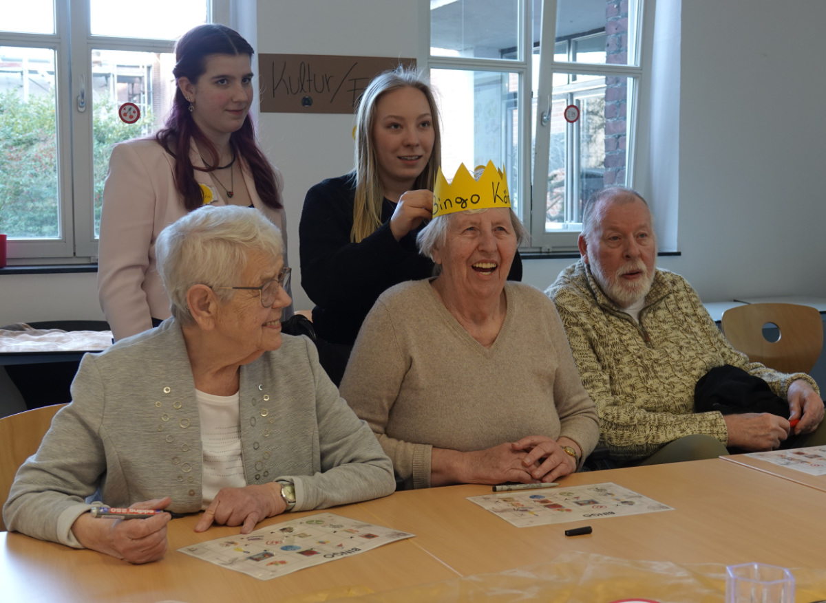Was haben ein üppiges Kuchenbuffet, griechischer Wein, eine Bingokönigin, ein Volleyballmatch und eigens verfasste Frühlingsgedichte mit Tiefgang gemeinsam? Na klar: das Frühlingscafé, zu dem die Sozialassistentinnen und -assistenten der Unterstufe rund 30 Seniorinnen und Senioren aus dem Adelheidhaus unseres Kooperationspartners, dem Caritasverband Geldern-Kevelaer, traditionell vor den Osterferien einluden. Nach einem geselligen Beisammensein bei Kaffee, Kuchen und erfrischenden Getränken bei frühlingshaft eingedeckter Tafel luden die Schülerinnen und Schüler zu Tanz und Musik (Stichwort „Griechischer Wein“), zum Bingospiel und zu körperlicher Betätigung bei einem Luftballon-Volleyballmatch ein.
