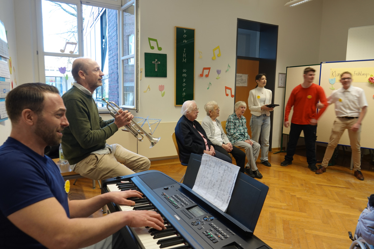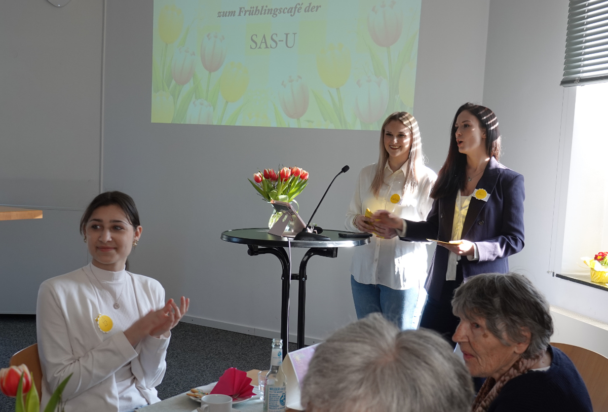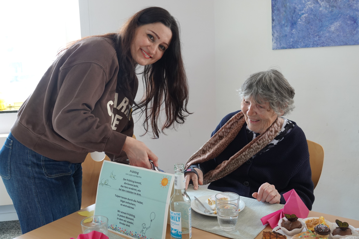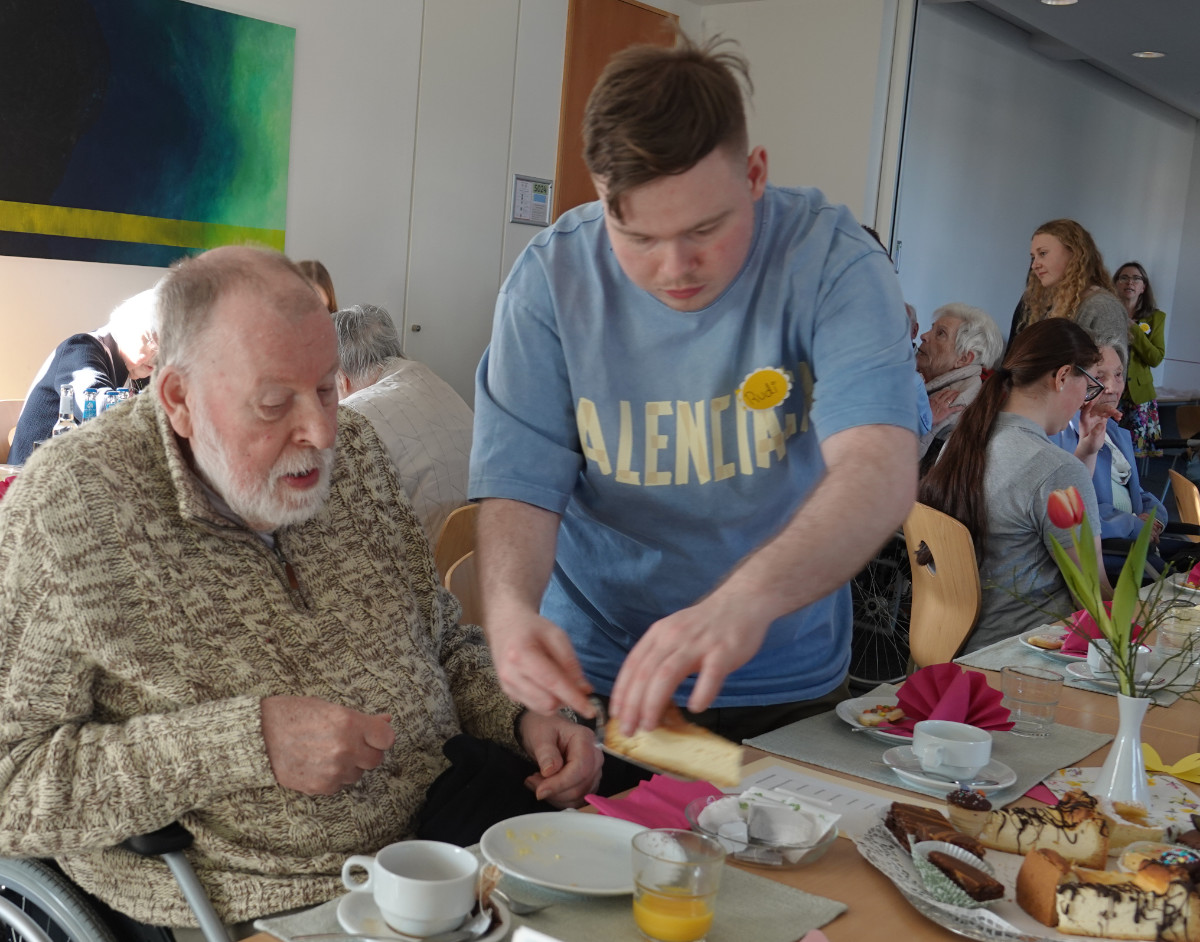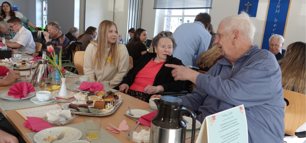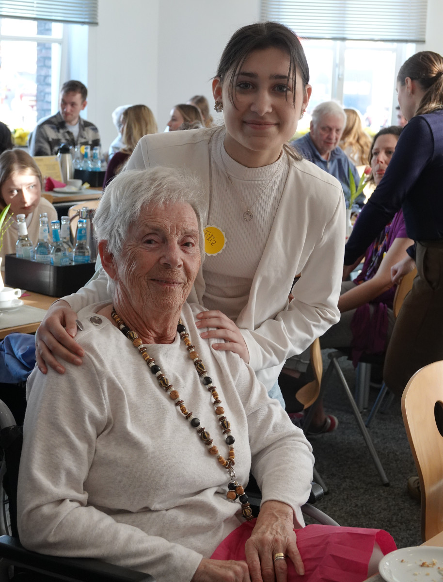 Was haben ein üppiges Kuchenbuffet, griechischer Wein, eine Bingokönigin, ein Volleyballmatch und eigens verfasste Frühlingsgedichte mit Tiefgang gemeinsam? Na klar: das Frühlingscafé, zu dem die Sozialassistentinnen und -assistenten der Unterstufe rund 30 Seniorinnen und Senioren aus dem Adelheidhaus unseres Kooperationspartners, dem Caritasverband Geldern-Kevelaer, traditionell vor den Osterferien einluden. Nach einem geselligen Beisammensein bei Kaffee, Kuchen und erfrischenden Getränken bei frühlingshaft eingedeckter Tafel luden die Schülerinnen und Schüler zu Tanz und Musik (Stichwort „Griechischer Wein“), zum Bingospiel und zu körperlicher Betätigung bei einem Luftballon-Volleyballmatch ein.
