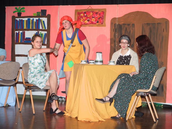 Da sind Frau Prysselius, Frau Granberg und Frau Settergreen schier baff. Mit militärischem Zack kommt Pippi Langstrumpf hereinmarschiert und begrüßt bei dieser edlen Kaffeetafel die feinen Damen, die angesichts des forschen Auftretens dieser Göre mit den dicken roten Zöpfen sprachlos vor Entsetzen sind. Ganz anders das Publikum: Das kringelt sich vor Lachen.