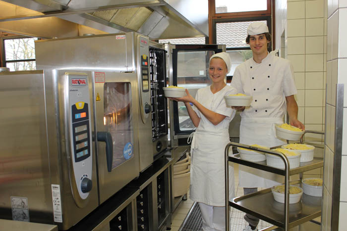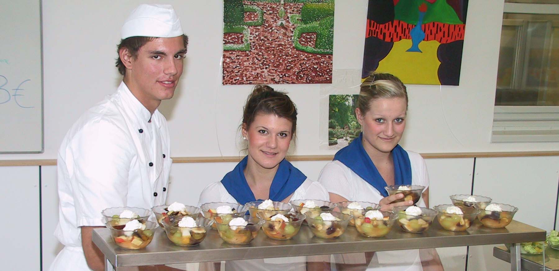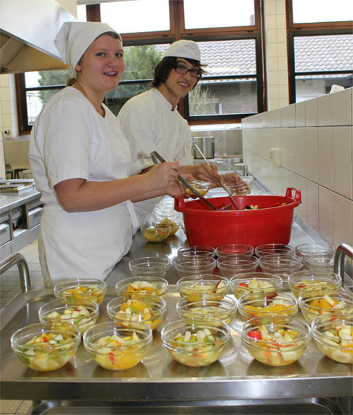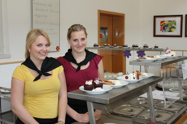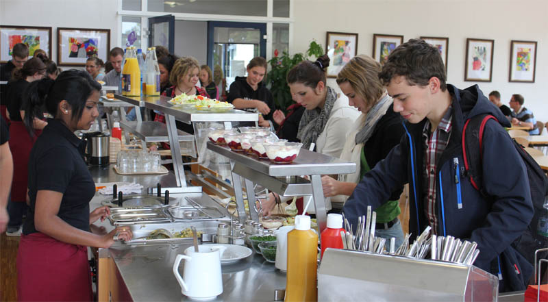 Verschiedene Fachklassen aus dem Bereich Ernährung und Hauswirtschaft bereiten im Unterricht in der schuleigenen Großküche die Speisen zu und finden auch im Service ein wichtiges Übungsfeld. Die angebotenen Menüs und Snacks verdienen immer die Attribute: lecker, frisch, gesund und preisgünstig: und sie finden reißenden Absatz!