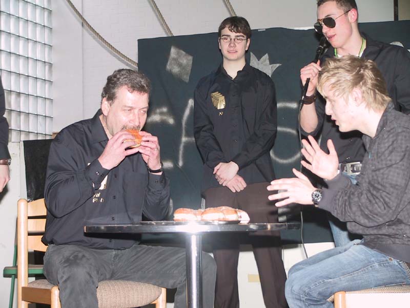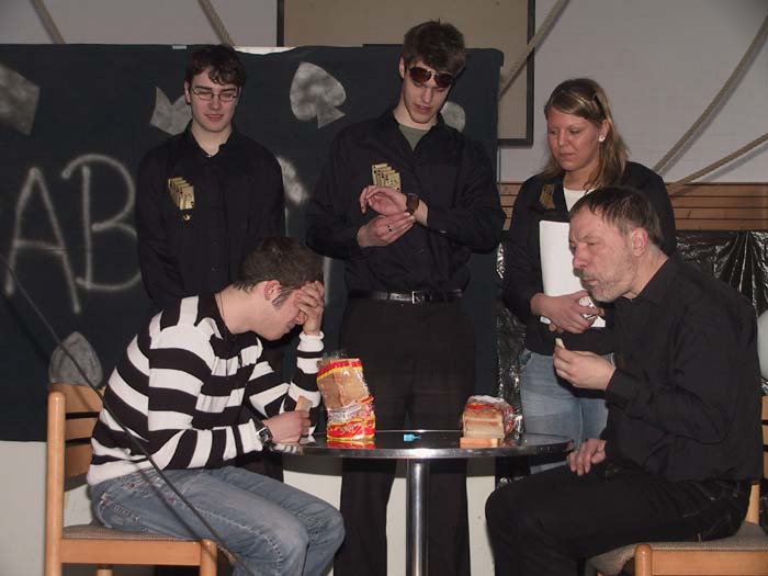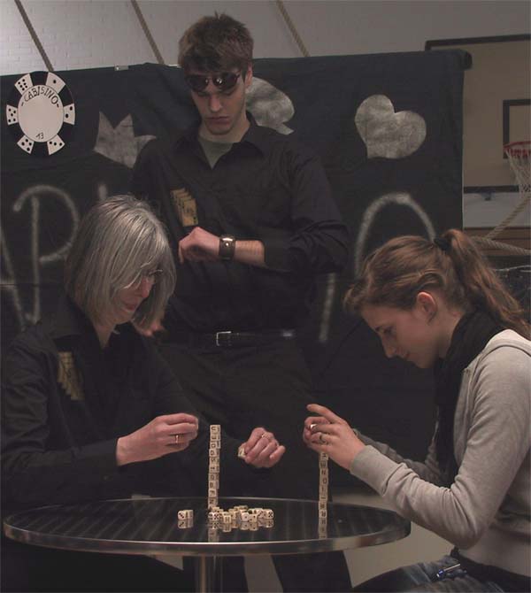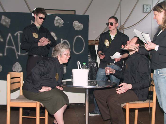 Die Geschichte ist schnell erzählt: Unser Schulleiter Herr van Essen soll ein heimlicher Spieler sein. Mit großer Limousine wurde er gemeinsam mit dem Jahrgangsstufenleiter Herrn Hülk vor das Cabisino chauffiert. Doch dann hatte er ein Problem: Er verzockte sich. Mit 7000 Euro soll er, so hörte man, in der Kreide stehen. Wie aber konnte er aus seinem Dilemma herauskommen? Er musste auf seine Kollegen setzen, die im Wettkampf gegen die Schüler siegen mussten. Ob das wohl gut ging?
