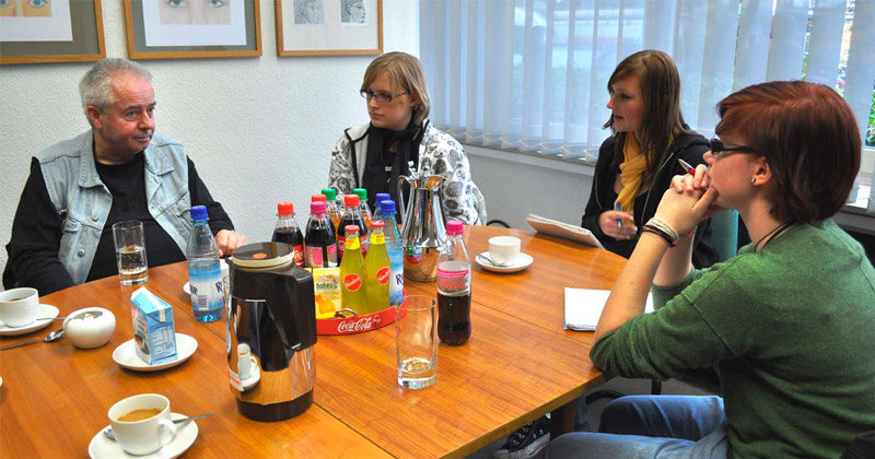 Auch in einem Gespräch im kleinen Kreis, das wir beiden vom Berufskolleg der Liebfrauenschule und zwei Redakteure von der Schülerzeitung des Lise-Meitner-Gymnasiums im Anschluss an den Vortrag mit Pfarrer Führer hatten, lauschten wir noch vielen zusätzlichen und detailreichen Erzählungen. Die Fragen die dabei noch aufkamen, beantwortete er sehr umfassend.