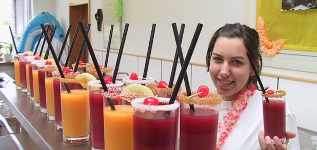 Am 26. April war es dann so weit. Exotische Gerichte wie Wraps, Orangensalate, Kiwi-Eistorte oder Huhn in Kokossoße machten die Gäste neugierig. Mit bunten Cocktails und verlockender Musik starteten wir in die Woche.