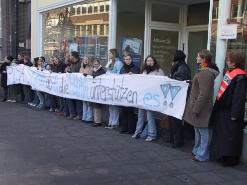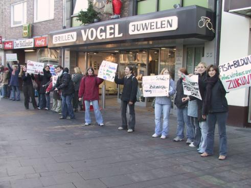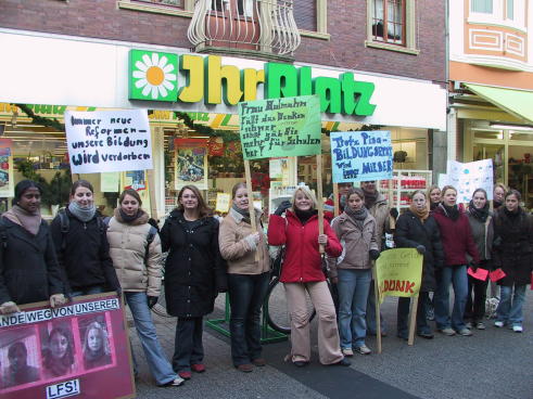 „Geiz ist nicht geil – Bildung ist unser aller Heil!“ oder „Pisa mies – trotzdem kein Kies!“ lauteten plakative Sprüche, mit denen die Jugendlichen darauf aufmerksam machten, dass sich das Land NRW trotz anders lautender Meldungen immer mehr aus der in der Landesverfassung verbrieften Pflicht herausstielt, für die Bildung ihrer Schüler aufzukommen.