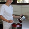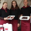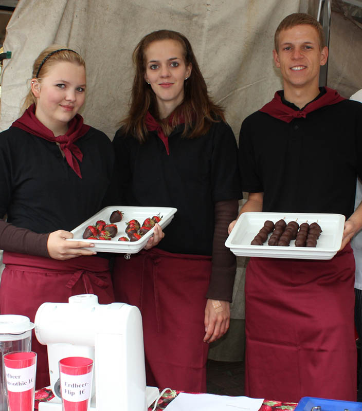 Großes Organisationstalent bewies Frau Verlinden, die die komplette Angebotspalette erstellt hatte. Dazu gehörten in Schokolade getauchte Erdbeeren, Erdbeerspieße vom Schokoladenbrunnen, Crêpes mit Erdbeeren, Kaffee, Erdbeer-Flips und nicht zu vergessen die Konfitüren wie Erdbeer-Tonkabohne, Erdbeer-Schokolade, Erdbeer-Kokos und Erdbeer-Rhababer, die durch die freundliche Unterstützung von Frau Schlattmann entstanden sind. Selbstverständlich wurden nur Erdbeeren aus regionalem Anbau verarbeitet. Dies war wohlbemerkt eine der meist gestellten Kundenfragen. Die gelungene Tischdekoration fertigten Frau Doekels und Frau Lörper mit der Unterstützung eines Kunstkurses an.