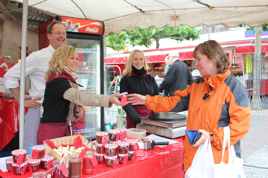 Nachdem die Leitung des Gelderner Wochenmarktes an unsere Schule herangetreten war und die Frage geäußert hatte, ob wir nicht am 27. Mai 2011 beim Erdbeermarkt teilnehmen wollen, war für uns natürlich sofort klar, dass die Liebfrauenschule auf jeden Fall dabei sein wird. Nachdem Frau Ripkens freundlicherweise ihr Einverständnis gegeben hatte, fanden sich auch direkt einige engagierte Lehrer und Lehrerinnen sowie Schüler und Schülerinnen aus der Klasse FH/11E. Der Andrang der gesamten Klasse, dabei mitzumachen, war so groß, dass uns nichts anderes übrig blieb, als das Los entscheiden zu lassen. Ferenc Barnick, Daniela Derksen, Michelle Fredericq, Lara Jankowski, Sabrina Kreetz, Laura Schmitz und Claire Schulz waren die Glücklichen, zu deren Gunsten sich das Los entschieden hatte.