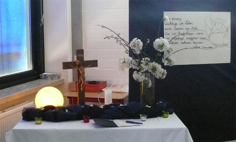Auch in diesem Jahr haben verschiedene Klassen unserer Schule gemeinsam mit dem Lehrerteam Frau Richter, Herrn Mäteling und Herrn Dr. Schmitz den Jugendkreuzweg vorbereitet. Sie haben sich mit den unterschiedlichsten Themen auseinander gesetzt, die Kreuze in unserem Leben und in unserer Gesellschaft darstellen, und diese auf verschiedene Art und Weise – als Rauminstallationen, mittels Powerpoint-Filmen, in Rollenspielen etc. – den Mitschülerinnen und Mitschülern nahe gebracht. Dargestellt wurden an verschiedenen (Kreuzweg-)Stationen zum Beispiel die „Kreuze“ Kindesmissbrauch, Zwangsheirat, Beschneidung, Arbeitslosigkeit und Mobbing.