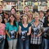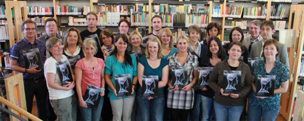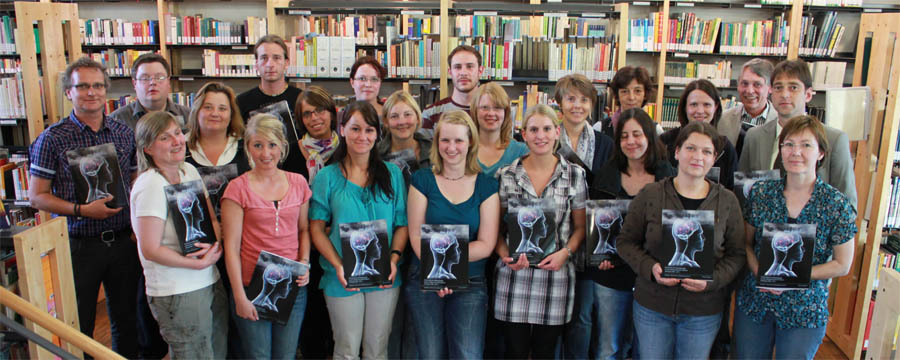 Bei der offiziellen Buchpräsentation gesellten sich unter die Studierenden der Fachschule für Heilpädagogik auch Johannes Kempkens (hintere Reihe, 2. v. re.), in dessen Druckerei das Werk hochwertig gedruckt wurde, und Markus Bexte (hintere Reihe, rechts) von der Volksbank an der Niers, die ebenso wie die Stadtwerke Geldern die Ausgabe mit einem großem Zuschuss finanziell unterstützte.