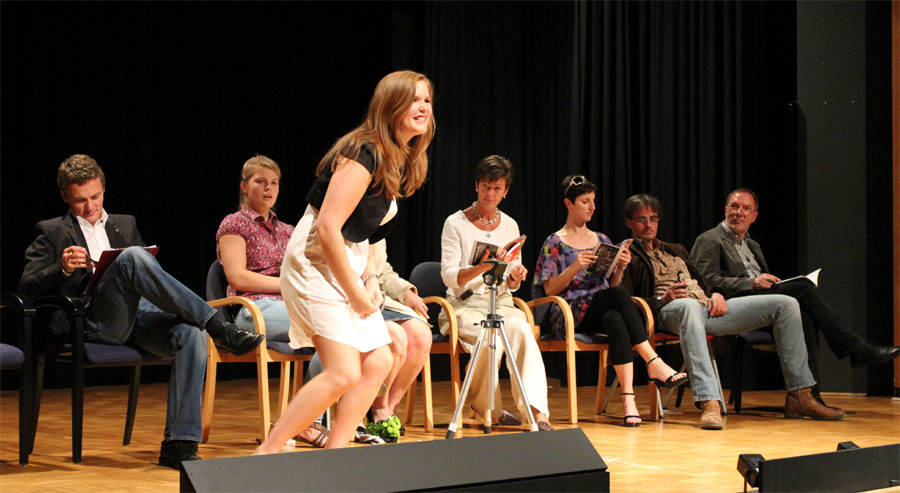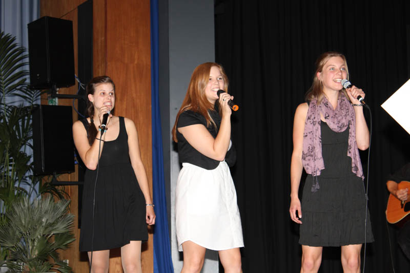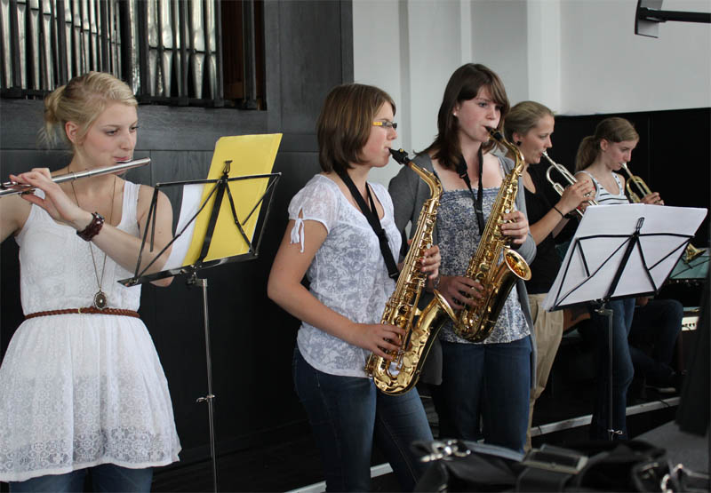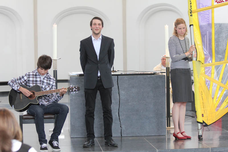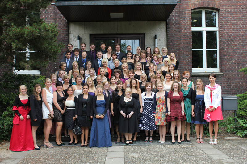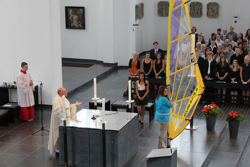 Der Ablauf bei diesen drei Entlassfeiern war stets sehr festlich und vom Programm nahezu identisch. Einer Eucharistiefeier in der Pfarrkirche St. Maria Magdalena, die von den Schülerinnen und Schülern vorbereitet und gestaltet worden war, schloss sich die feierliche Zeugnisübergabe in der Aula an. Hier traten das Blechbläserquintett unter der Leitung von Jürgen Terhorst auf sowie eine Schülerinnengruppe mit einem musikalischen Abschied, für den Dr. Christoph Schmitz an der Gitarre verantwortlich war. Begeisterten Applaus erhielten auch die Schülerinnen und Schüler aus der AH/12S1 und ihr Lehrer Marc Baum für den kreativen und aufwändigen Schwarzlichttanz zur Musik von „What else is there?“ Viel Gelächter ernteten einige Lehrer, die als skurrile Personen ein Theaterstück inszenierten, bei dem sie auf den Beginn einer Schultheateraufführung warteten, die aber letzten Endes ins Wasser fiel.