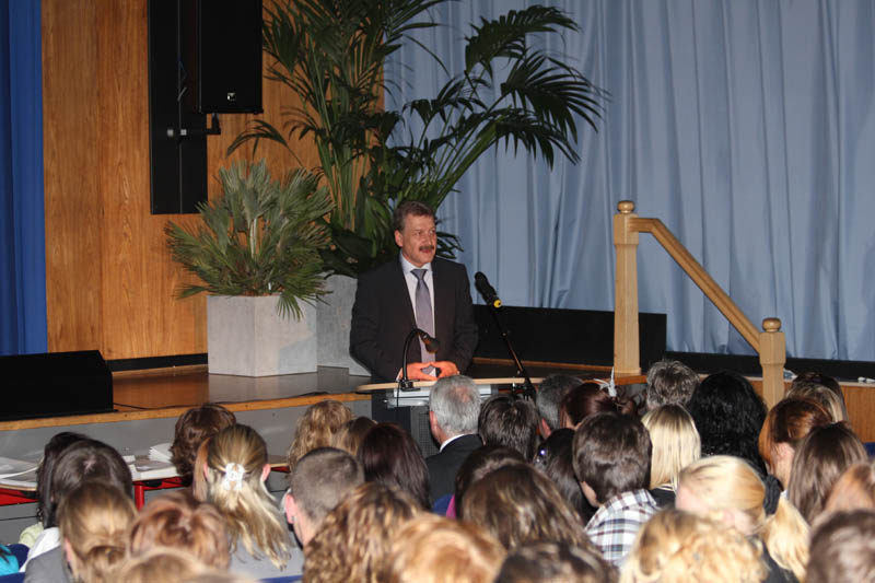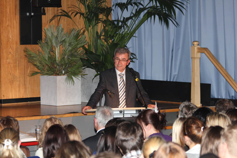 Zuvor hatte Herr van Essen als Schulleiter zu den Enlass-Schülern gesprochen. Am Donnerstag überbrachte zudem Michael Schweers als Leiter der Abteilung Katholische Schulen des Bistums Münster die Grüße des Schulträgers. Nach der Zeugnisausgabe fand dann der traditionelle Umtrunk im Pädagogischen Zentrum statt.
