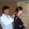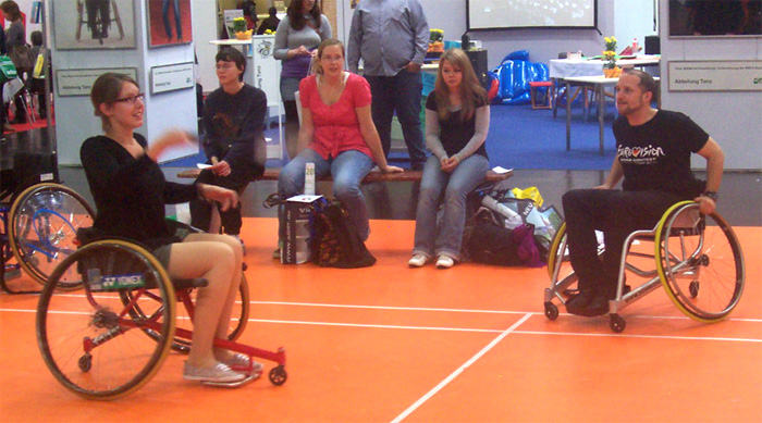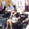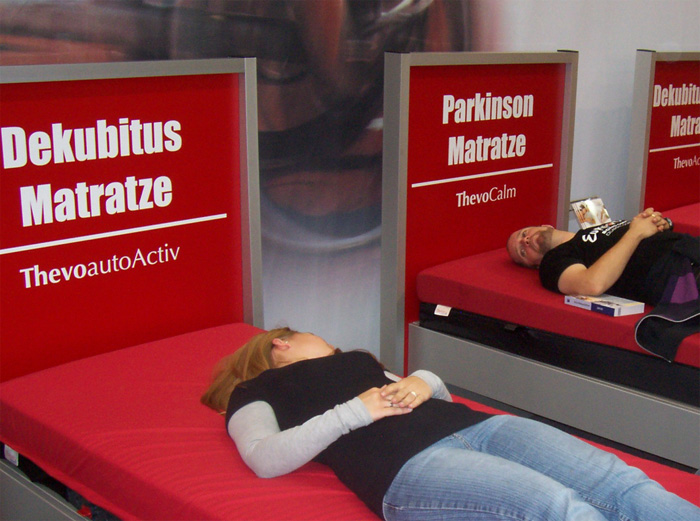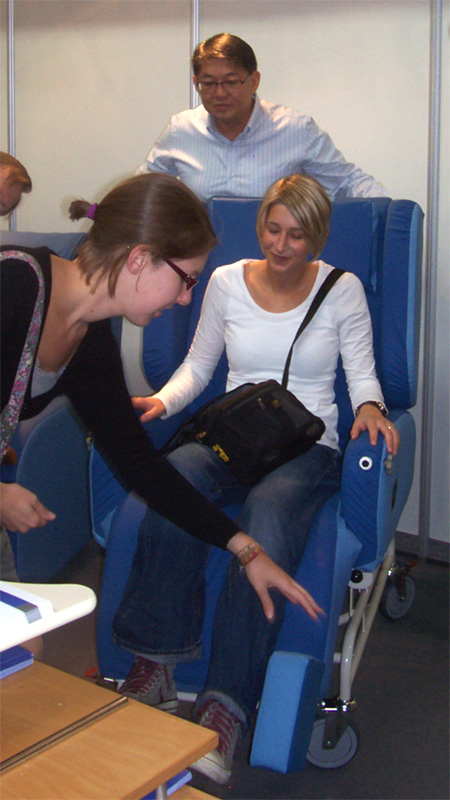 Zu sehen gab es „auf“ der REHACARE – wie der Name vermuten lässt- alles Erdenkliche rund um Pflege, Therapie und Alltagsbewältigung für Menschen mit Handicap, von der Anziehhilfe für Kompressionsstrümpfe über Massageliegen bis hin zum rollstuhltauglichen Auto. Neben den zu erwartenden Fachsimpeleien mit den zahlreichen Ausstellern wie etwa Trägern von Pflegeeinrichtungen und Herstellern technischer Errungenschaften, wurde der Besuch aber vor allem zu einem spannenden Selbsterfahrungstrip. So konnte man Probe-Snoezeln, treppentaugliche Rollstühle testen, sich auf Demenzmatratzen niederlassen oder versuchen, im Rolli Badminton zu spielen (was schwieriger ist, als es aussieht…), um nur einige Beispiele zu nennen. Unser Mitschüler Alex gewann bei einer der vielen Mitmachaktionen sogar den zweiten Preis des Tages und durfte sich über ein Buchgeschenk freuen. Ihm war es gelungen, in der zweitschnellsten Zeit eine Schleife mit nur einer Hand zu machen und sich so die Schnürsenkel zuzubinden.