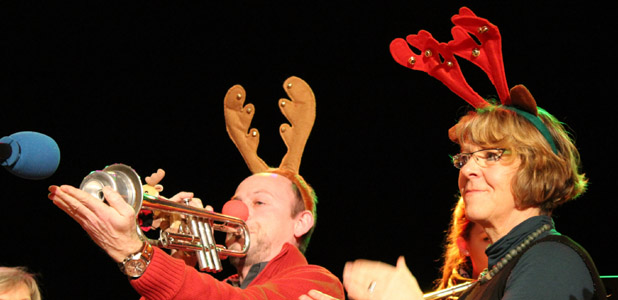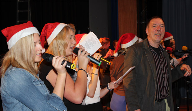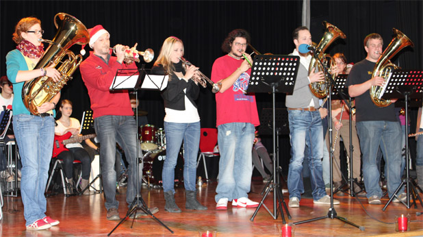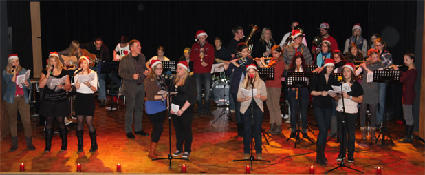 Für viele ist es der schönste Tag im ganzen Schuljahr: der letzte Schultag vor den Weihnachtsferien. Dann treffen sich die Klassen mit ihrem Klassenlehrer zum gemütlichen Frühstück. Doch nicht nur das: Das Adventssingen mit Herrn Baumgärtner und einer großen Schar von Sängern und Instrumentalisten, darunter auch immer wieder Ehemalige, die einfach noch immer dabei sein wollen, sorgt für eine vorweihnachtliche Stimmung in der Aula. Es ist bewundernswert, wie die Woge der Begeisterung von der Bühne in das Publikum überschwappt, wo mitgesungen und mitgeklatscht wird. Wenn jemand glaubt, Jugendliche wären dafür nicht zu begeistern, der sei hier eines Besseren belehrt.