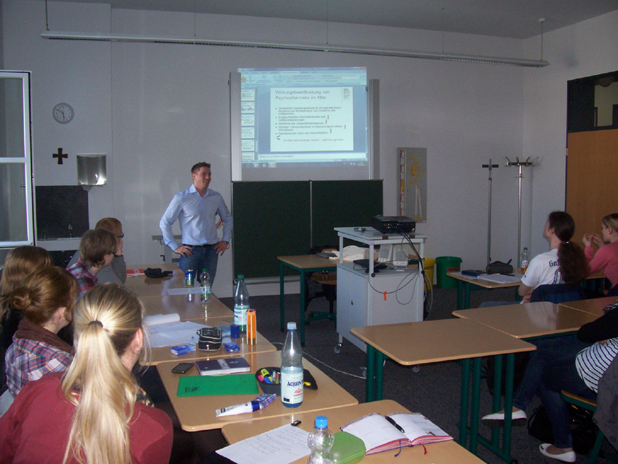 Am 23.03.2012 wurden wir, die Studierenden der HEP/O, im Fach Psychiatrie von Herrn Petja Kramer besucht. Herr Kramer ist Apotheker und Inhaber der Drachen-Apotheke in Gel-dern, wodurch er einigen Studierenden unserer Klasse bereits bekannt war. Zuvor hatten wir im Psychiatrieunterricht verschiedene psychiatrische Erkrankungen besprochen und uns besonders intensiv mit dem Thema „Depressionen“ befasst. Da gerade auch bei diesem Krankheitsbild neben der Psychotherapie vor allem die medikamentöse Therapie bedeutsam ist, waren wir daran interessiert, von einem Apotheker Genaueres über die Arzneimittelgruppe der so genannten Psychopharmaka zu erfahren.
