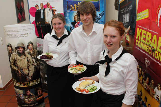 Während in der Küche also schon lange vor den Projekttagen die Töpfe heiß wurden, feilte die Gruppe für Werbung und Dekoration fleißig am (Rollen-)Konzept. Da alle Schülerinnen und Schüler das Thema „Gerolltes und Gewickeltes aus der Küche“ spontan mit Filmrollen in Verbindung brachten, war die Grundidee schnell gefunden. Jetzt mussten also entsprechende Werbeslogans getextet, Flyer gedruckt, Filmplakate zusammengestellt, Scheinwerfer poliert und Musik ausgewählt werden.
