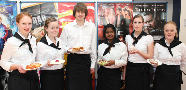 Gespannt warteten die 22 Schülerinnen und Schüler der Fachoberschule für Ernährung und Hauswirtschaft (FH/11E) auf die zahlreichen Stars und Sternchen, die als Gäste an ihrer Projektwoche „Total von der Rolle“ vom 19. – 23. März 2012 in der Mensa teilnehmen würden. Über einen roten Teppich, vorbei am „Walk of Fame“, der mit den Sternen bekannter Hollywoodgrößen verziert und von einer schier endlosen Menge von Filmplakaten umgeben war, gelangten die Besucher in die ebenso stilsicher dekorierte Mensa. Damit die Gäste sich fühlen konnten wie echte Stars, begleitete sie nicht nur Filmmusik auf ihren Schritten, sondern auch gleißendes Scheinwerferlicht suggerierte ihnen ein Gefühl von Prominenz. Kurz vor dem Betreten des Speisesaals schließlich lauerte eine professionell ausgerüstete Paparazza auf alle fotografierwilligen Besucher.