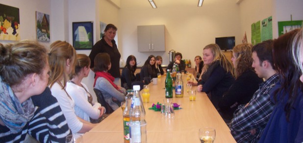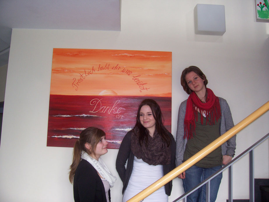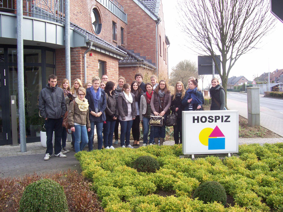 Am 20.03.12 machte sich unsere Klasse per Bus auf den Weg nach Wetten, um das Hospiz des Hospizvereins Kevelaer e.V. zu besuchen. Als wir dort ankamen, begrüßte uns eine sehr nette und offene Dame, welche die Leiterin des Hospizes ist. Ihr Name ist Birgitt Brünken. Sie führte uns in einen Raum, wo eine große Tafel mit Getränken für uns eingedeckt war, so dass wir uns gleich sehr willkommen fühlten. Bei diesem ersten Gang durch den ansprechenden, mit Bildern und Blumen gestalteten Eingangsbereich des Hospizes fiel uns schon auf, dass eine sehr ruhige und wohnliche Atmosphäre im gesamten Haus herrschte.