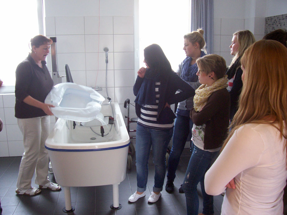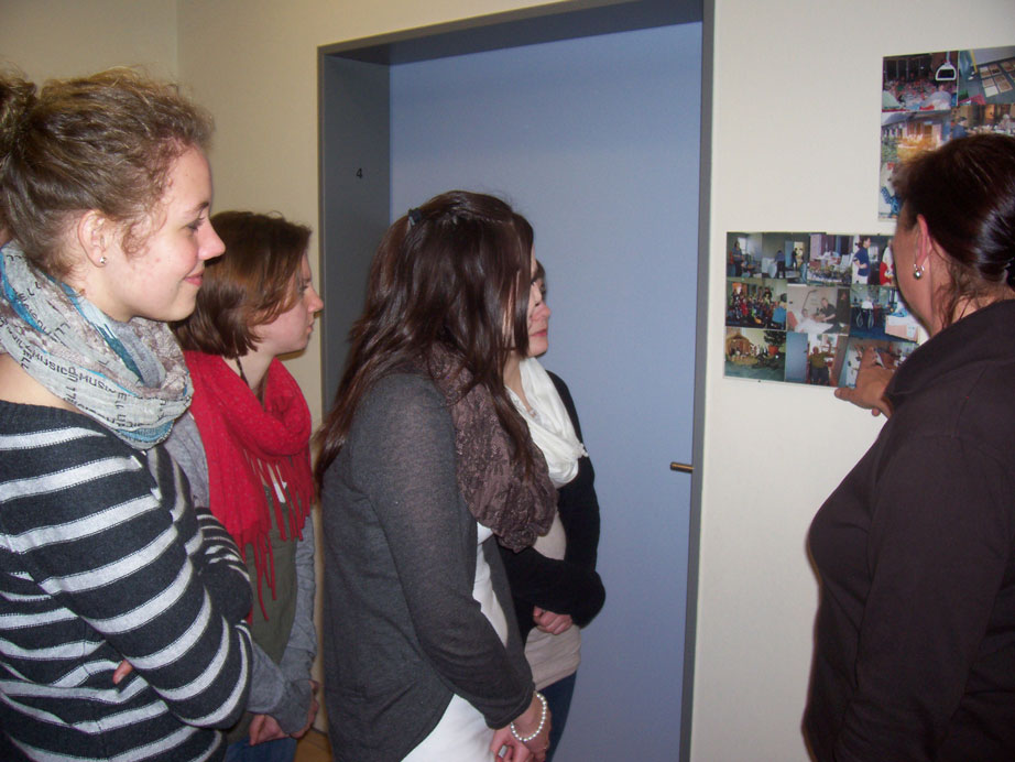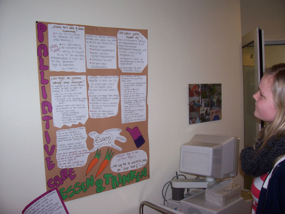 Im Anschluss daran interessierte uns die Pflege der so genannten Gäste (der Begriff geht auf die Bezeichnung Hospiz = Herberge zurück). Bei der Beantwortung unserer Fragen stellten wir fest, dass die Pflege der Gäste sehr individuell gestaltet wird. Zum Beispiel bei der Körperpflege wird sehr darauf geachtet, dass für die Gäste nur das verwendet wird, was sie gewohnt sind und was ihren Bedürfnissen entspricht, z.B wird nur das Shampoo verwendet, welches der Gast immer verwendet hat und es wird nicht irgendein Pflegemittel eingesetzt. Der Gast steht mit seinen Wünschen und Bedürfnissen im Mittelpunkt.