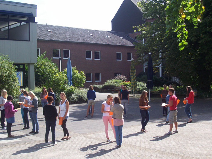 Rund 350 neue Schülerinnen und Schüler wurden am ersten Schultag nach den Sommerferien neu in die Liebfrauenschule aufgenommen. Die angehenden Sozialhelfer/innen, die künftigen Erzieher/innen und die angehenden Heilerziehungspfleger aus den jeweiligen Oberstufenklassen hatten bunte Begrüßungstage für die „Neuen“ íhres Bildungsganges vorbereitet, damit diese ihren Schulstart an unserem Berufskolleg möglichst kreativ, aber ebenso informativ begehen konnten. Da wurde gesungen und gebastelt, gespielt und gelacht, Infos ausgetauscht und erste Kontakte zu Mitschülern und Lehrern geknüpft. Zum gemütlichen Kaffeetrinken luden zudem die Sozialhelfer/innen ihre neue Unterstufenschüler ein.