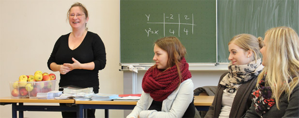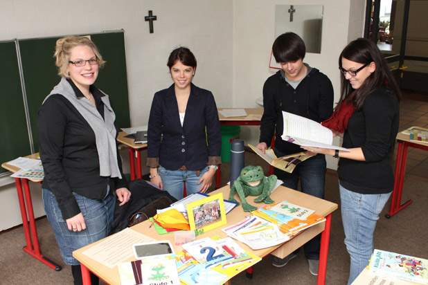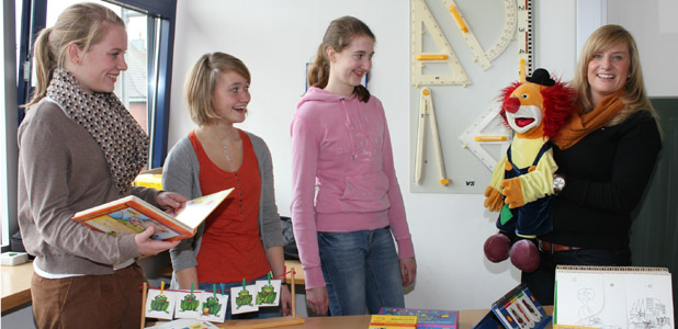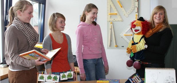 Rund 80 Referenten waren in das Berufskolleg des Bistums Münster nach Geldern gekommen, um im Rahmen des 6. Infotages Beruf und Studium den Schülern mehr als 60 Berufe und Studienmöglichkeiten, vorwiegend aus den Bereichen Sozial– und Gesundheitswesen sowie Ernährung und Hauswirtschaft vorzustellen. Nicht aber die bloße Weitergabe von Fakten war an jenem Tag angesagt. Dass praktische Einblicke in den Berufs– und Studienalltag oft im Vordergrund standen, freute besonders Irmtrud Reilmann, die, unterstützt von einigen Kollegen, die Veranstaltung vorbereitet hatte: „Uns liegt daran, im Rahmen der Berufswahlentscheidung unseren Schülern möglichst anschaulich einen Einblick in Studium und Beruf zu geben!“ Wie aber wäre das besser möglich als über erfahrene Referenten und Ehemalige der Liebfrauenschule, die noch recht nah dran sind an den Wünschen und Vorstellungen der aktuellen Schüler? Nicht wenige der „Experten“ hatten daher früher selbst einmal die Schulbank an der Liebfrauenschule gedrückt wie zum Beispiel Susanne Börger, die als Logopädin beim Caritasverband Geldern-Kevelaer beschäftigt ist und die seit Beginn, also zum sechsten Mal, mit an Bord war. „Ich komme stets gerne!“, verriet sie, einen Wäschekorb voller anschaulicher Medien tragend, mit denen sie einen realistischen Einblick in ihre sprechtherapeutische Tätigkeit gab.