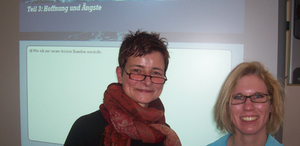 Frau Schaad und Frau Pick gaben uns einen wertvollen Einblick in ihre eigene berufliche Praxis in der Betreuung von Menschen mit Behinderungen in der Sterbephase. Darüber hinaus schenkten sie uns konkrete Anregungen, mit denen wir selber Menschen im Sterbeprozess begleiten können. Mental konnten wir uns zunächst durch einen kleinen Film auf das Thema einstimmen. Darin wurden abwechselnd Zitate eines Abschiedsbriefes mit traumhaften Bildern unterlegt.