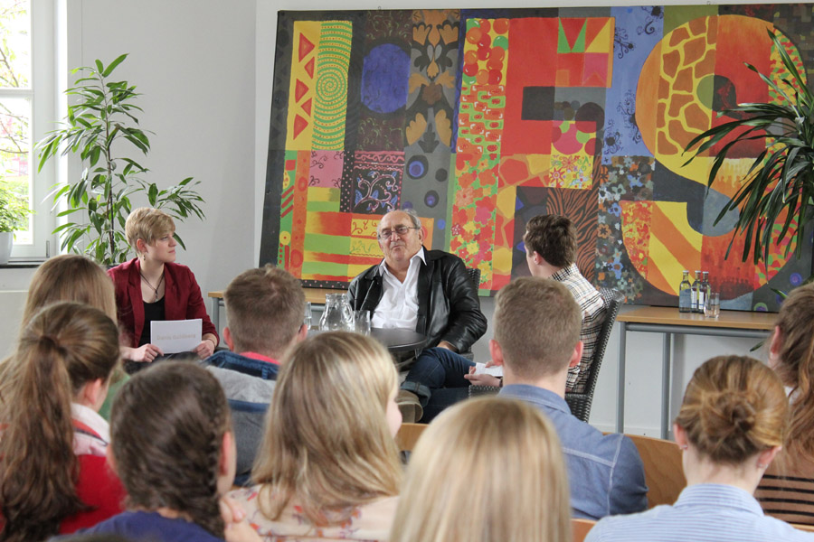 Ein Vorbereitungsteam bestehend aus zehn Schülerinnen und Schülern durfte Denis Goldberg, am Morgen des 26. April, in Empfang nehmen und schon bei einer gemütlichen Kaffeerunde die ersten Eindrücke sammeln. Natürlich waren die meisten zuerst etwas zurückhaltend und versuchten den Gast über seinen beeindruckenden Lebenslauf etwas zu fragen. Umso erstaunter waren wir alle, als Herr Goldberg uns direkt mitteilte, dass er niemand besonderes ist, sondern genau so ein „alter Opi“ wie viele andere. Er war viel mehr interessiert an unseren eigenen Hobbys und Lebensläufen und meinte, dass er noch genügend von sich und seinem Leben erzählen würde, wenn unsere Klassenkameraden dabei wären. Nach dem gemütlichen und familiären Zusammensitzen starteten wir unsere kleine Diskussionsrunde. Lena und Andreas, das Moderationsteam hatten im Vorfeld schon einige ausgewählte Fragen und Anreize gesammelt, die auch den anderen Mitschülern einen facettenreichen Eindruck von unserem Gast ermöglichen sollten. Denis Goldberg erzählte uns alles von seinen frühen Kinderjahren und wie er von seinen Eltern schon als kleines Kind politisches Engagement mitbekam bis hin zu den Jahren im Gefängnis und traurigen Todesfällen in seiner Familie.