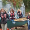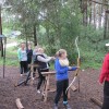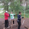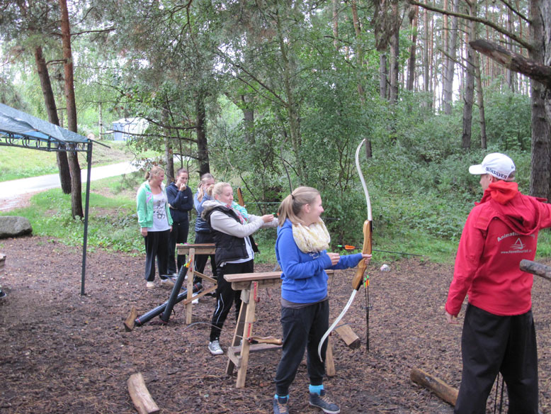 Leider konnte nach der Ankunft am Montag Morgen das Programm nicht wie geplant mit Kanutour und Bogenschießen Im Wechsel durchgeführt werden, da es aus Kübeln goss. Die Kanutour fiel buchstäblich ins Wasser, leider auch das geplante Picknick unterwegs. Die Lebensmittel wurde daher so auf alle Mobilheime verteilt. Bis 15 Uhr konnten dann die letzten Mobilheime bezogen werden. Beim Bogenschießen konnten dann doch noch zwei Gruppen ihre Treffsicherheit unter Beweis stellen. Am Abend kam die Sonne doch heraus, so dass man mal an den kleinen Strand gehen konnte. Nach dem Kochen des Abendessens in den Mobilheimen trafen sich aus allen Klassen Schüler und Lehrer in dem Restaurant auf ein Bierchen oder Cocktail, um zu klönen.